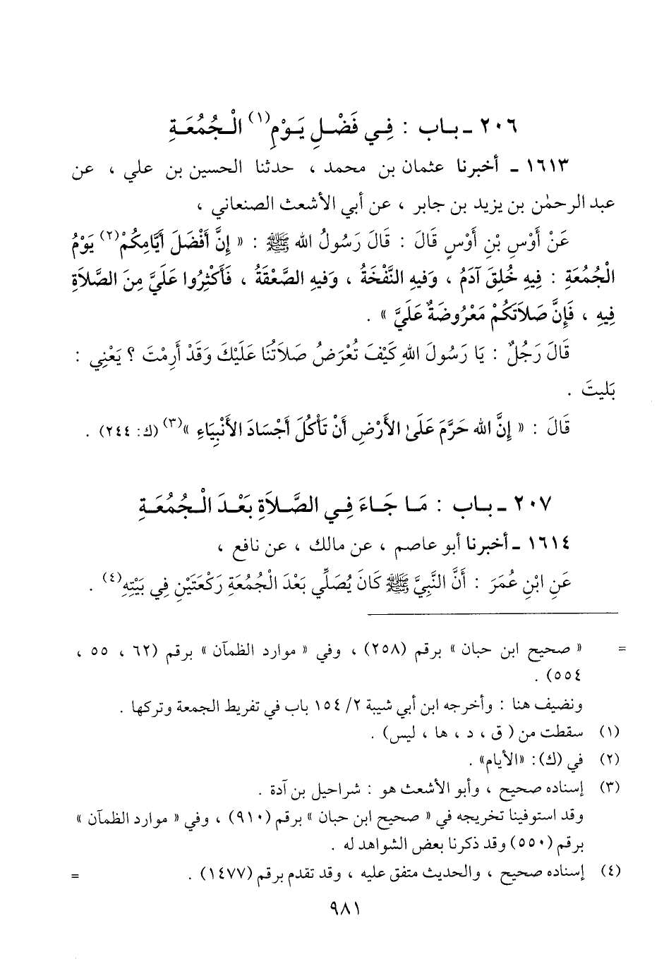 1613 - أَخْبَرَنَا عُثْمَانُ بْنُ مُحَمَّدٍ، حَدَّثَنَا الْحُسَيْنُ بْنُ عَلِيٍّ، عَنْ عَبْدِ الرَّحْمَنِ بْنِ يَزِيدَ بْنِ جَابِرٍ، عَنْ أَبِي الْأَشْعَثِ الصَّنْعَانِيِّ، عَنْ أَوْسِ بْنِ أَوْسٍ قَالَ: قَالَ رَسُولُ اللَّهِ صَلَّى اللهُ عَلَيْهِ وَسَلَّمَ: " §إِنَّ أَفْضَلَ أَيَّامِكُمْ يَوْمُ الْجُمُعَةِ: فِيهِ خُلِقَ آدَمُ، وَفِيهِ النَّفْخَةُ، وَفِيهِ الصَّعْقَةُ، فَأَكْثِرُوا عَلَيَّ مِنَ الصَّلَاةِ فِيهِ، فَإِنَّ صَلَاتَكُمْ مَعْرُوضَةٌ عَلَيَّ "Qإسناده صحيح