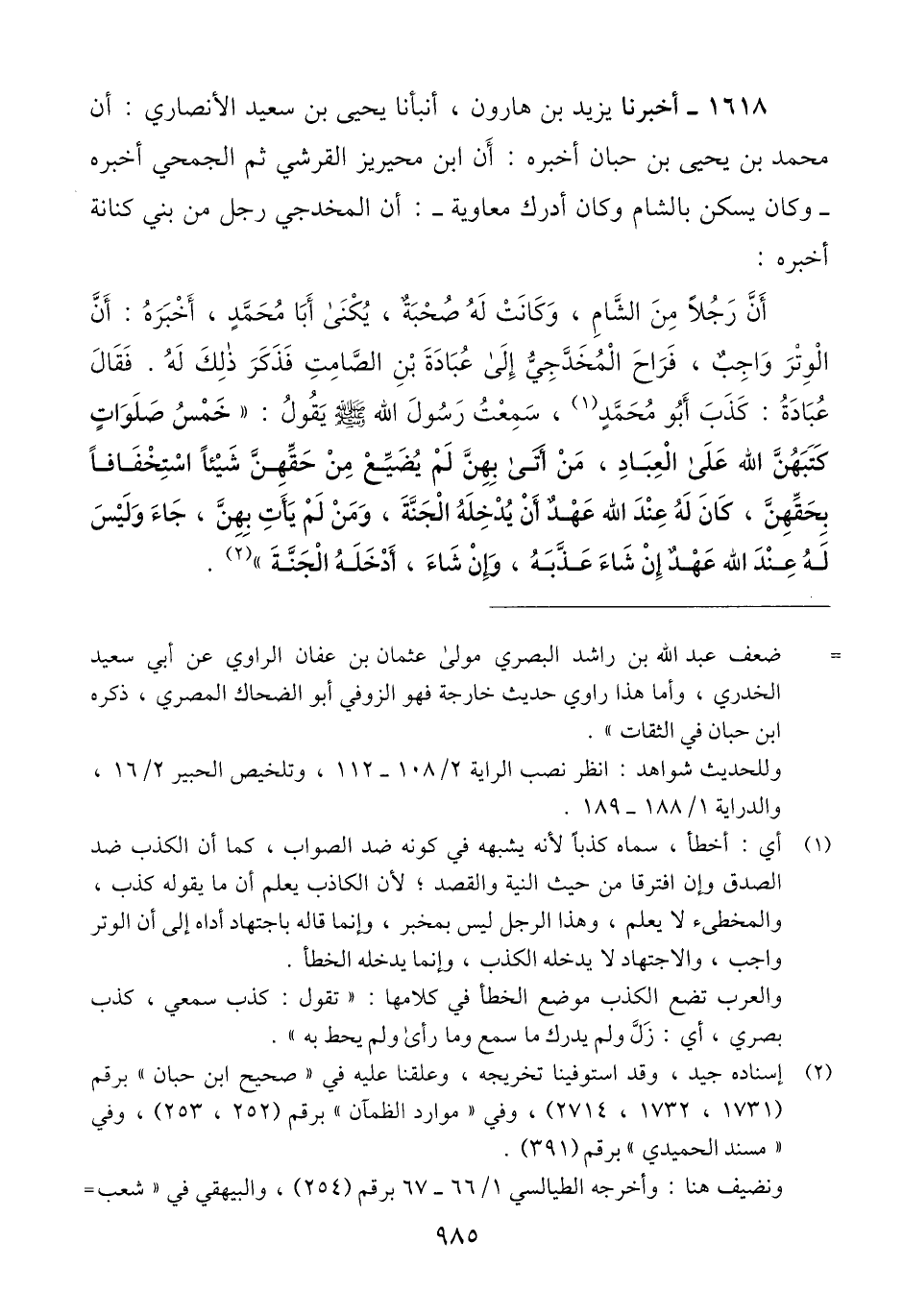 1618 - أَخْبَرَنَا يَزِيدُ بْنُ هَارُونَ، أَنْبَأَنَا يَحْيَى بْنُ سَعِيدٍ الْأَنْصَارِيُّ، أَنَّ مُحَمَّدَ بْنَ يَحْيَى بْنِ حَبَّانَ، أَخْبَرَهُ، أَنَّ ابْنَ مُحَيْرِيزٍ الْقُرَشِيَّ ثُمَّ الْجُمَحِيَّ، أَخْبَرَهُ - وَكَانَ يَسْكُنُ بِالشَّامِ وَكَانَ أَدْرَكَ مُعَاوِيَةَ - أَنَّ الْمُخْدَجِيَّ رَجُلٌ مِنْ بَنِي كِنَانَةَ أَخْبَرَهُ، أَنَّ رَجُلًا مِنْ الشَّامِ وَكَانَتْ لَهُ صُحْبَةٌ يُكْنَى أَبَا مُحَمَّدٍ، أَخْبَرَهُ: أَنَّ الْوِتْرَ وَاجِبٌ، فَرَاحَ الْمُخْدَجِيُّ إِلَى عُبَادَةَ بْنِ الصَّامِتِ، فَذَكَرَ ذَلِكَ لَهُ، فَقَالَ: عُبَادَةُ: كَذَبَ أَبُو مُحَمَّدٍ، سَمِعْتُ رَسُولَ اللَّهِ صَلَّى اللهُ عَلَيْهِ وَسَلَّمَ يَقُولُ: «§خَمْسُ صَلَوَاتٍ كَتَبَهُنَّ اللَّهُ عَلَى الْعِبَادِ، مَنْ أَتَى بِهِنَّ لَمْ يُضَيِّعْ مِنْ حَقِّهِنَّ شَيْئًا اسْتِخْفَافًا بِحَقِّهِنَّ، كَانَ لَهُ عِنْدَ اللَّهِ عَهْدٌ أَنْ يُدْخِلَهُ الْجَنَّةَ، وَمَنْ لَمْ يَأْتِ بِهِنَّ، جَاءَ وَلَيْسَ لَهُ عِنْدَ اللَّهِ عَهْدٌ إِنْ شَاءَ عَذَّبَهُ، وَإِنْ شَاءَ، أَدْخَلَهُ الْجَنَّةَ» Qإسناده جيد