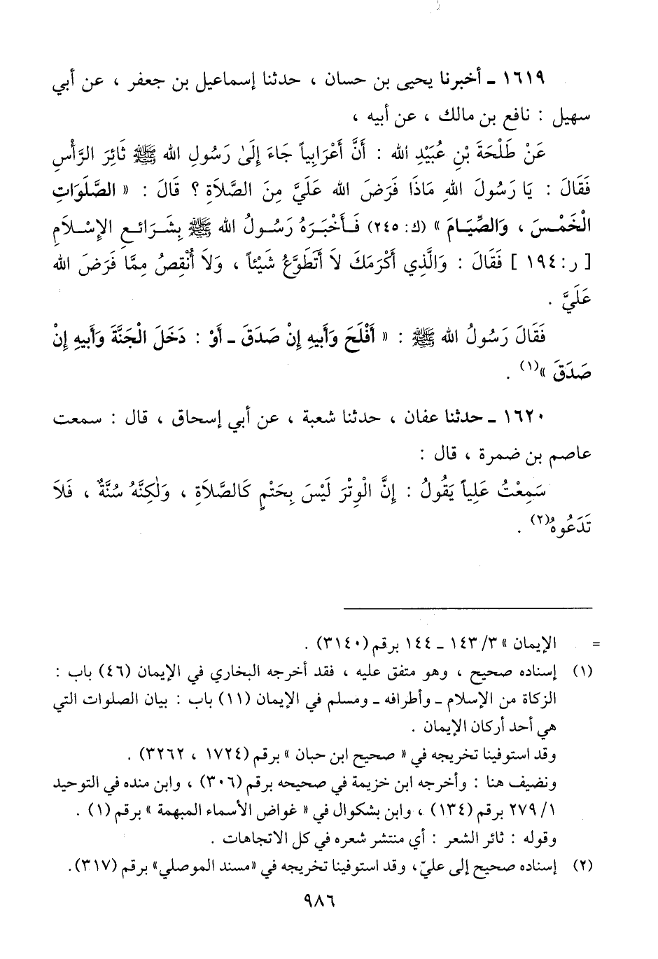 1619 - أَخْبَرَنَا يَحْيَى بْنُ حَسَّانَ، حَدَّثَنَا إِسْمَاعِيلُ بْنُ جَعْفَرٍ، عَنْ أَبِي سُهَيْلٍ نَافِعِ بْنِ مَالِكٍ، عَنْ أَبِيهِ، عَنْ طَلْحَةَ بْنِ عُبَيْدِ اللَّهِ، أَنَّ أَعْرَابِيًّا جَاءَ إِلَى رَسُولِ اللَّهِ صَلَّى اللهُ عَلَيْهِ وَسَلَّمَ ثَائِرَ الرَّأْسِ، فَقَالَ: يَا رَسُولَ اللَّهِ مَاذَا فَرَضَ اللَّهُ عَلَيَّ مِنَ الصَّلَاةِ؟ قَالَ: «§الصَّلَوَاتِ الْخَمْسَ، وَالصِّيَامَ»، فَأَخْبَرَهُ رَسُولُ اللَّهِ صَلَّى اللهُ عَلَيْهِ وَسَلَّمَ بِشَرَائِعِ الْإِسْلَامِ، فَقَالَ: وَالَّذِي أَكْرَمَكَ لَا أَتَطَوَّعُ شَيْئًا، وَلَا أَنْقُصُ مِمَّا فَرَضَ اللَّهُ عَلَيَّ ". فَقَالَ رَسُولُ اللَّهِ صَلَّى اللهُ عَلَيْهِ وَسَلَّمَ: «أَفْلَحَ وَأَبِيهِ إِنْ صَدَقَ - أَوْ دَخَلَ الْجَنَّةَ وَأَبِيهِ إِنْ صَدَقَ -» Qإسناده صحيح
