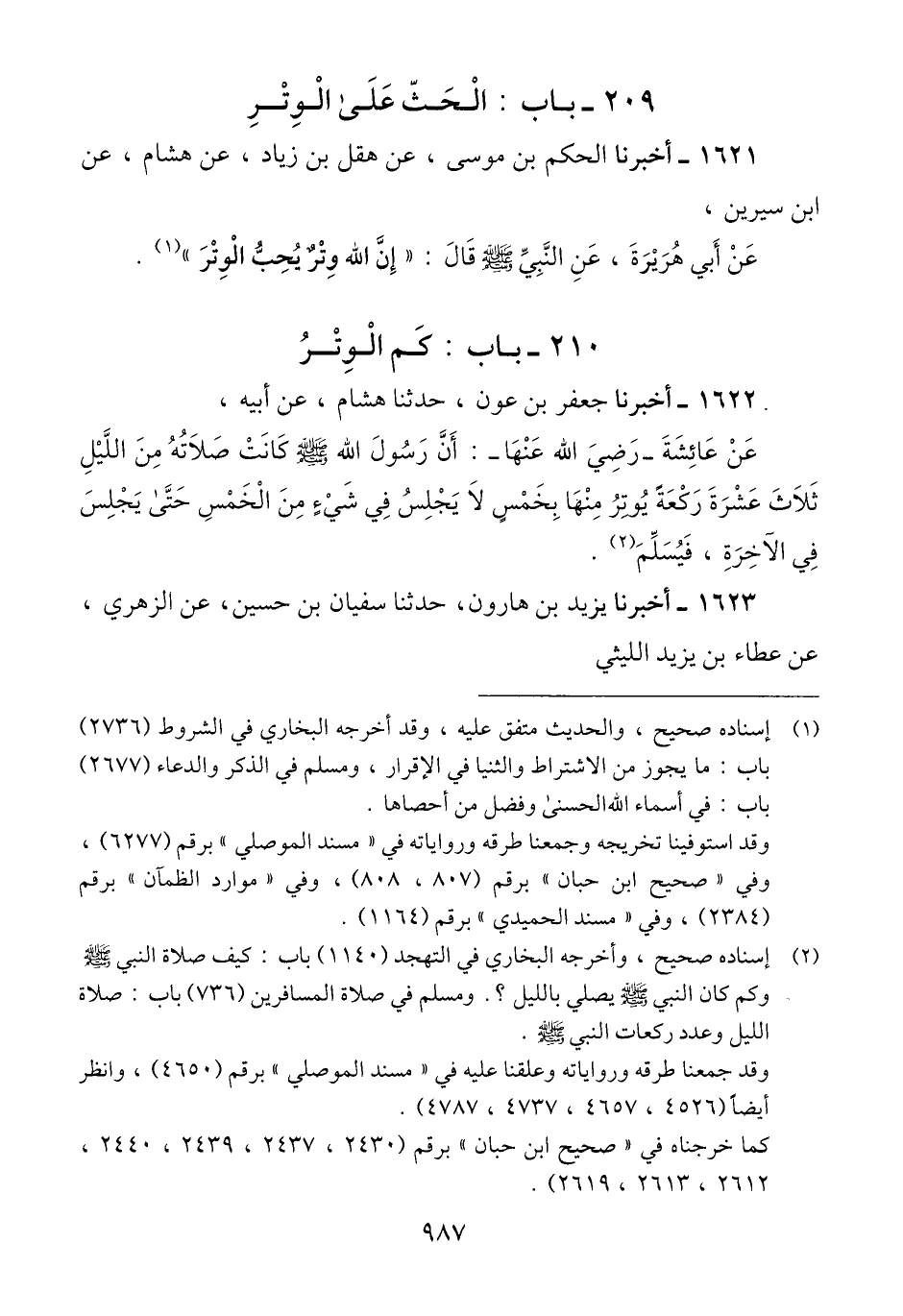 1621 - أَخْبَرَنَا الْحَكَمُ بْنُ مُوسَى، عَنْ هِقْلِ بْنِ زِيَادٍ، عَنْ هِشَامٍ، عَنْ ابْنِ سِيرِينَ، عَنْ أَبِي هُرَيْرَةَ، عَنِ النَّبِيِّ صَلَّى اللهُ عَلَيْهِ وَسَلَّمَ قَالَ: «§إِنَّ اللَّهَ وِتْرٌ يُحِبُّ الْوِتْرَ» Qإسناده صحيح