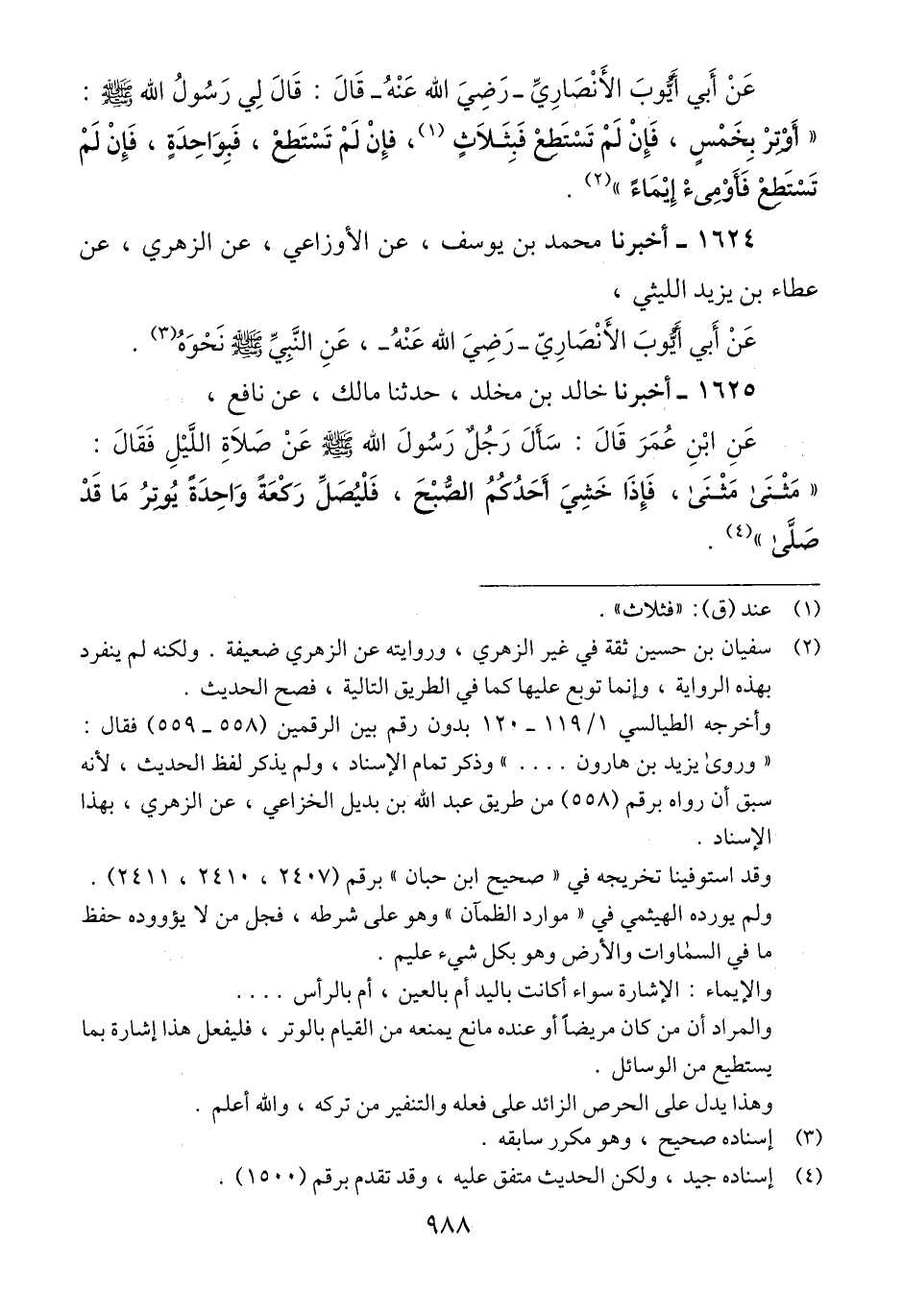 1625 - أَخْبَرَنَا خَالِدُ بْنُ مَخْلَدٍ، حَدَّثَنَا مَالِكٌ، عَنْ نَافِعٍ، عَنْ ابْنِ عُمَرَ قَالَ: سَأَلَ رَجُلٌ رَسُولَ اللَّهِ صَلَّى اللهُ عَلَيْهِ وَسَلَّمَ عَنْ صَلَاةِ اللَّيْلِ، فَقَالَ: «§مَثْنَى مَثْنَى، فَإِذَا خَشِيَ أَحَدُكُمُ الصُّبْحَ، فَلْيُصَلِّ رَكْعَةً وَاحِدَةً تُوتِرُ مَا قَدْ صَلَّى» -[989]- قِيلَ لِأَبِي مُحَمَّدٍ: تَأْخُذُ بِهِ؟ قَالَ: «نَعَمْ» Qإسناده جيد ولكن الحديث متفق عليه