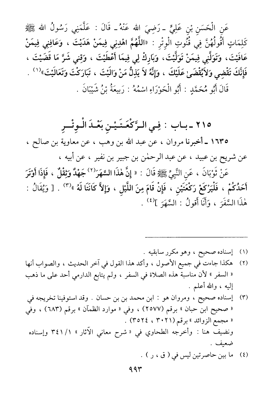 1635 - أَخْبَرَنَا مَرْوَانُ، عَنْ عَبْدِ اللَّهِ بْنِ وَهْبٍ، عَنْ مُعَاوِيَةَ بْنِ صَالِحٍ، عَنْ شُرَيْحِ بْنِ عُبَيْدٍ، عَنْ عَبْدِ الرَّحْمَنِ بْنِ جُبَيْرِ بْنِ نُفَيْرٍ، عَنْ أَبِيهِ، عَنْ ثَوْبَانَ، عَنِ النَّبِيِّ صَلَّى اللهُ عَلَيْهِ وَسَلَّمَ قَالَ: «§إِنَّ هَذَا السَّهَرَ جَهْدٌ وَثِقَلٌ، فَإِذَا أَوْتَرَ أَحَدُكُمْ، فَلْيَرْكَعْ رَكْعَتَيْنِ، فَإِنْ قَامَ مِنَ اللَّيْلِ، وَإِلَّا كَانَتَا لَهُ» وَيُقَالُ: هَذَا السَّفَرُ وَأَنَا أَقُولُ: السَّهَرُQإسناده صحيح
