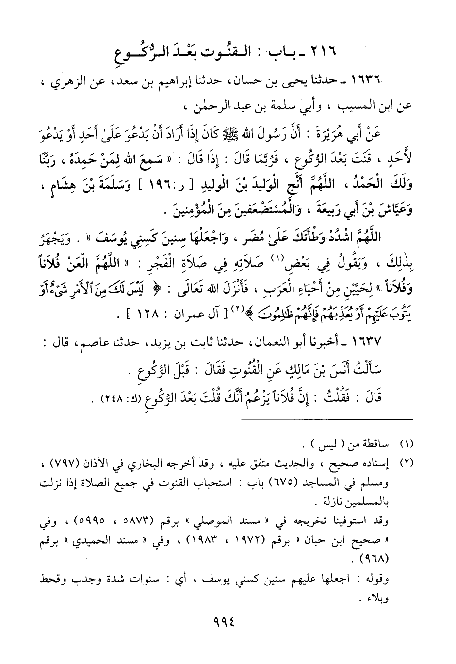 1636 - حَدَّثَنَا يَحْيَى بْنُ حَسَّانَ، حَدَّثَنَا إِبْرَاهِيمُ بْنُ سَعْدٍ، عَنْ الزُّهْرِيِّ، عَنْ ابْنِ الْمُسَيَّبِ، وَأَبِي سَلَمَةَ بْنِ عَبْدِ الرَّحْمَنِ، عَنْ أَبِي هُرَيْرَةَ، أَنَّ رَسُولَ اللَّهِ صَلَّى اللهُ عَلَيْهِ وَسَلَّمَ كَانَ إِذَا أَرَادَ أَنْ يَدْعُوَ عَلَى أَحَدٍ أَوْ يَدْعُوَ لِأَحَدٍ، قَنَتَ بَعْدَ الرُّكُوعِ، فَرُبَّمَا قَالَ: إِذَا قَالَ: «سَمِعَ اللَّهُ لِمَنْ حَمِدَهُ، رَبَّنَا وَلَكَ الْحَمْدُ، اللَّهُمَّ أَنْجِ الْوَلِيدَ بْنَ الْوَلِيدِ، وَسَلَمَةَ بْنَ هِشَامٍ، وَعَيَّاشَ بْنَ أَبِي رَبِيعَةَ، وَالْمُسْتَضْعَفِينَ مِنَ الْمُؤْمِنِينَ، اللَّهُمَّ اشْدُدْ وَطْأَتَكَ عَلَى مُضَرَ، وَاجْعَلْهَا سِنِينَ كَسِنِي يُوسُفَ»، وَيَجْهَرُ بِذَلِكَ، وَيَقُولُ فِي بَعْضِ صَلَاتِهِ فِي صَلَاةِ الْفَجْرِ: «اللَّهُمَّ الْعَنْ فُلَانًا، وَفُلَانًا لِحَيَّيْنِ مِنْ أَحْيَاءِ الْعَرَبِ»، فَأَنْزَلَ اللَّهُ تَعَالَى: {§لَيْسَ لَكَ مِنَ الْأَمْرِ شَيْءٌ أَوْ يَتُوبَ عَلَيْهِمْ أَوْ يُعَذِّبَهُمْ فَإِنَّهُمْ ظَالِمُونَ} [آل عمران: 128] Qإسناده صحيح