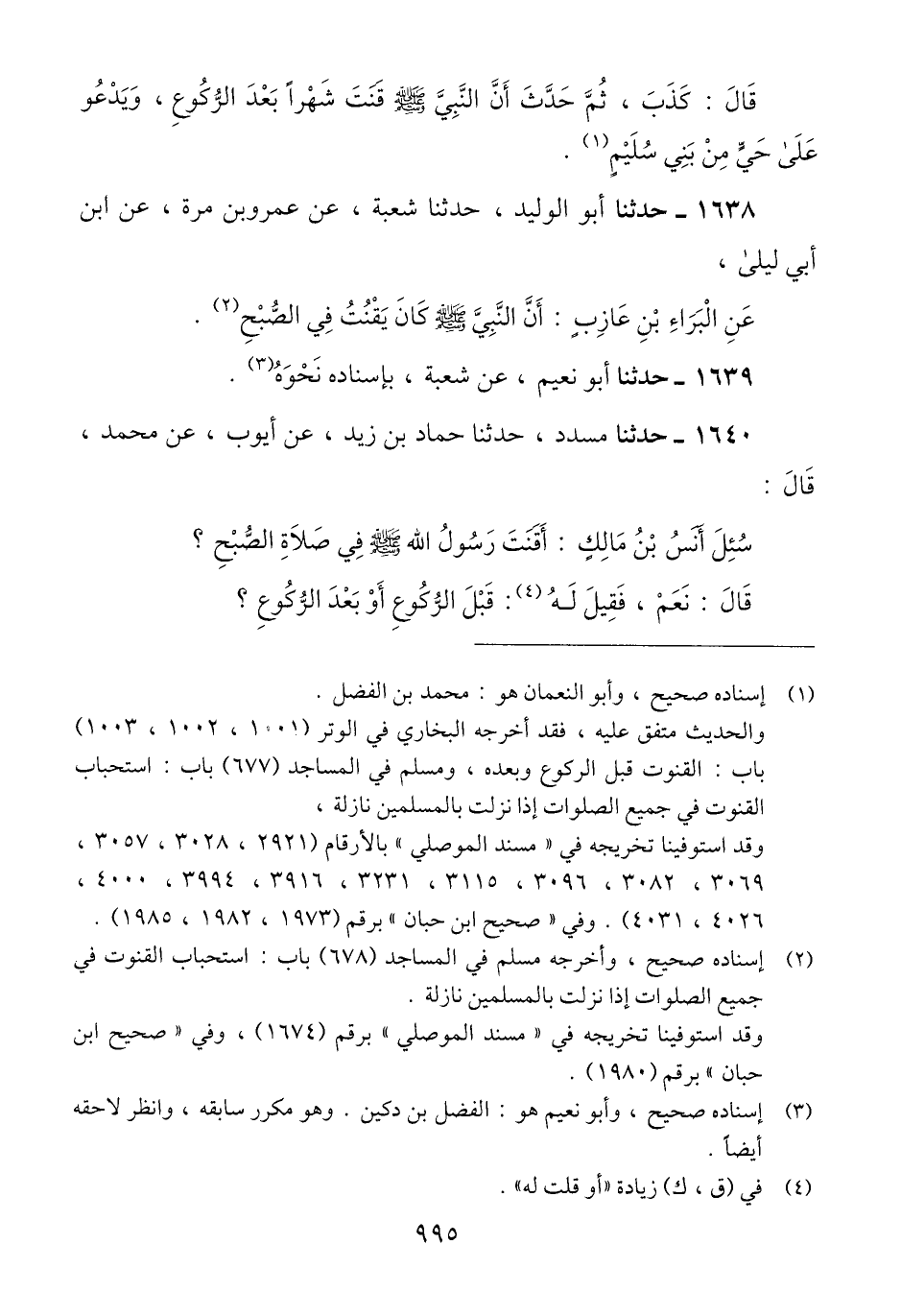 1638 - حَدَّثَنَا أَبُو الْوَلِيدِ، حَدَّثَنَا شُعْبَةُ، عَنْ عَمْرِو بْنِ مُرَّةَ، عَنْ ابْنِ أَبِي لَيْلَى، عَنْ الْبَرَاءِ بْنِ عَازِبٍ، «أَنَّ النَّبِيَّ صَلَّى اللهُ عَلَيْهِ وَسَلَّمَ كَانَ §يَقْنُتُ فِي الصُّبْحِ» Qإسناده صحيح