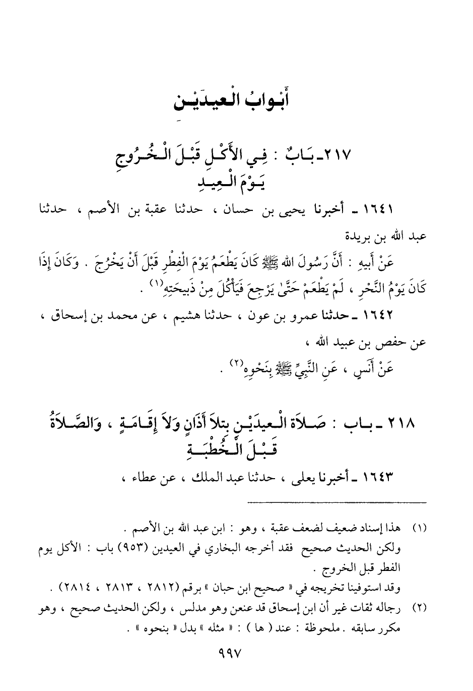 1641 - أَخْبَرَنَا يَحْيَى بْنُ حَسَّانَ، حَدَّثَنَا عُقْبَةُ بْنُ الْأَصَمِّ، حَدَّثَنَا عَبْدُ اللَّهِ بْنُ بُرَيْدَةَ، عَنْ أَبِيهِ، «أَنَّ رَسُولَ اللَّهِ صَلَّى اللهُ عَلَيْهِ وَسَلَّمَ كَانَ §يَطْعَمُ يَوْمَ الْفِطْرِ قَبْلَ أَنْ يَخْرُجَ»، «وَكَانَ إِذَا كَانَ يَوْمُ النَّحْرِ لَمْ يَطْعَمْ حَتَّى يَرْجِعَ، فَيَأْكُلَ مِنْ ذَبِيحَتِهِ» Qهذا إسناد ضعيف لضعف عقبة وهو: ابن عبد الله بن الأصم. ولكن الحديث صحيح