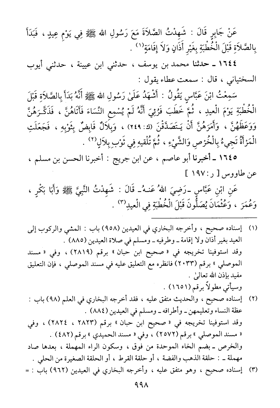 1645 - أَخْبَرَنَا أَبُو عَاصِمٍ، عَنْ ابْنِ جُرَيْجٍ، أَخْبَرَنَا الْحَسَنُ بْنُ مُسْلِمٍ، عَنْ طَاوُسٍ، عَنْ ابْنِ عَبَّاسٍ رَضِيَ اللَّهُ عَنْهُ قَالَ: «§شَهِدْتُ النَّبِيَّ صَلَّى اللهُ عَلَيْهِ وَسَلَّمَ وَأَبَا بَكْرٍ، وَعُمَرَ، وَعُثْمَانَ يُصَلُّونَ قَبْلَ الْخُطْبَةِ فِي الْعِيدِ» Qإسناده صحيح
