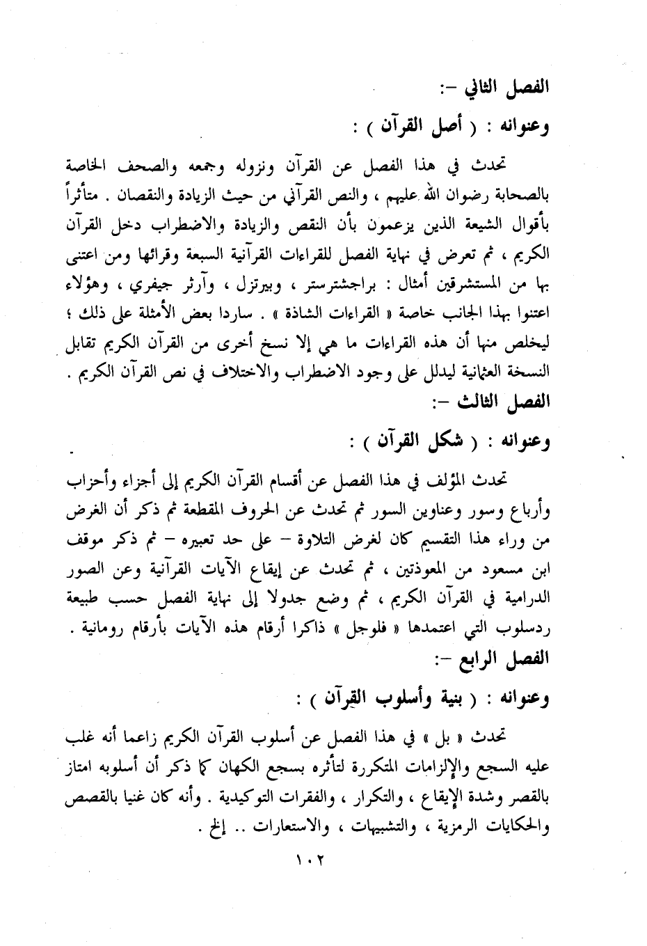 تحدث في هذا الفصل عن القرآن ونزوله وجمعه والصحف الخاصة بالصحابة رضوان اللّه عليهم، والنص القرآني من حيث الزيادة والنقصان. متأثرا بأقوال الشيعة الذين يزعمون بأن النقص والزيادة والاضطراب دخل القرآن الكريم، ثم تعرض في نهاية الفصل للقراءات القرآنية السبعة وقرائها ومن اعتنى بها من المستشرقين أمثال: براجشترستر، وبيرتزل، وآرثر جيفري، وهؤلاء اعتنوا بهذا الجانب خاصة «القراءات الشاذة». ساردا بعض الأمثلة على ذلك؛ ليخلص منها أن هذه القراءات ما هي إلا نسخ أخرى من القرآن الكريم تقابل النسخة العثمانية ليدلل على وجود الاضطراب والاختلاف في نص القرآن الكريم.