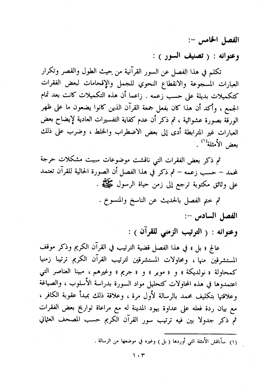 ثم ذكر بعض الفقرات التي ناقشت موضوعات سببت مشكلات حرجة لمحمد - حسب زعمه - ثم ذكر في هذا الفصل أن الصورة الحالية للقرآن تعتمد على وثائق مكتوبة ترجع إلى زمن حياة الرسول صلّى اللّه عليه وسلّم.