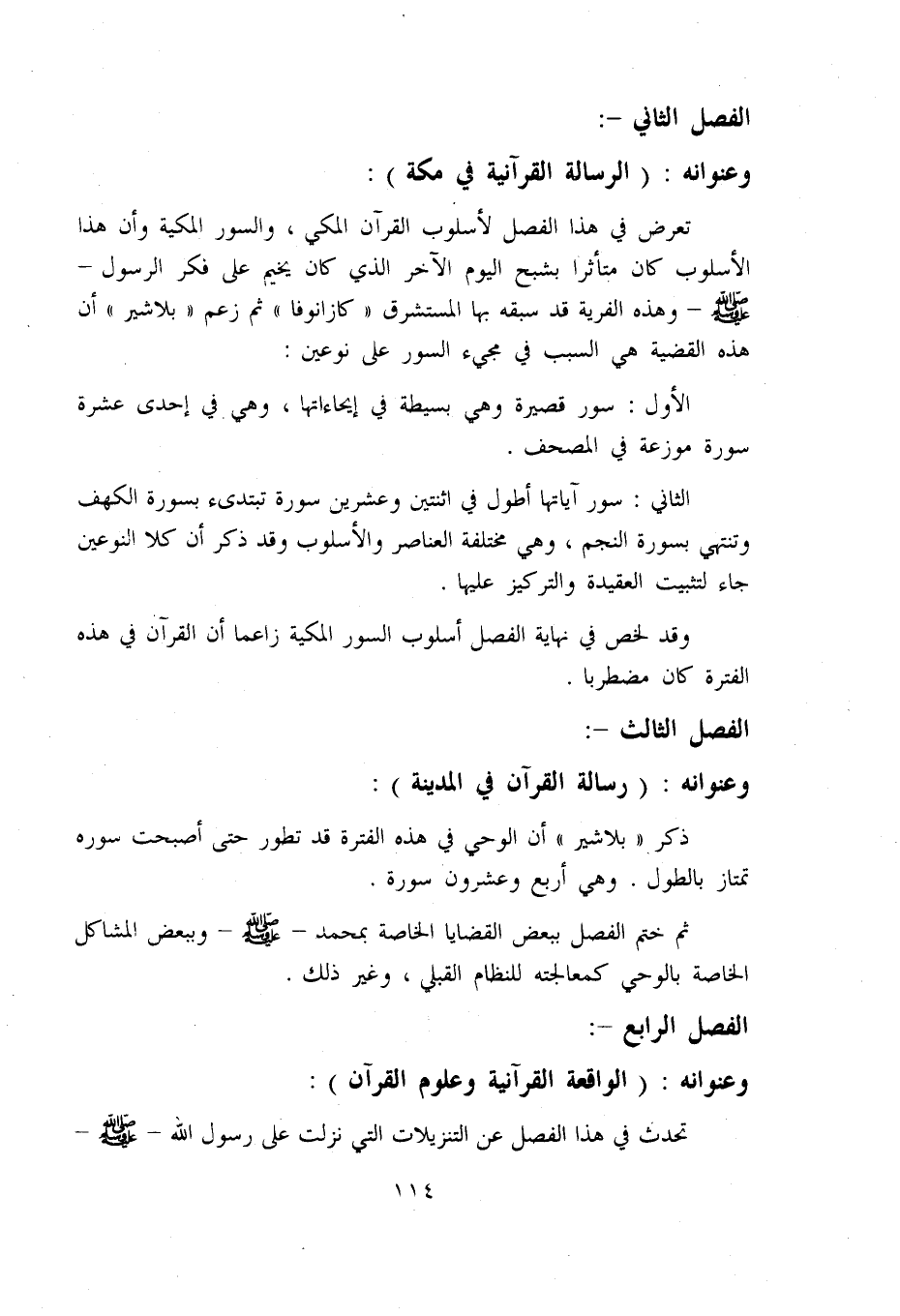 تعرض في هذا الفصل لأسلوب القرآن المكي، والسور المكية وأن هذا الأسلوب كان متأثرا بشبح اليوم الآخر الذي كان يخيم على فكر الرسول - صلّى اللّه عليه وسلّم - وهذه الفرية قد سبقه بها المستشرق «كازانوفا» ثم زعم «بلاشير» أن هذه القضية هي السبب في مجيء السور على نوعين: