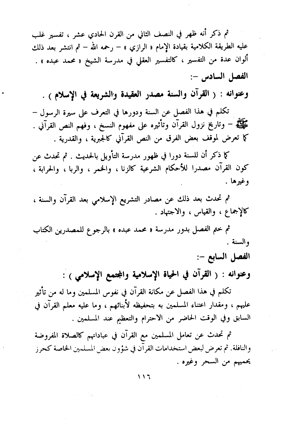 الفصل السادس -: وعنوانه: (القرآن والسنة مصدر العقيدة والشريعة في الإسلام).