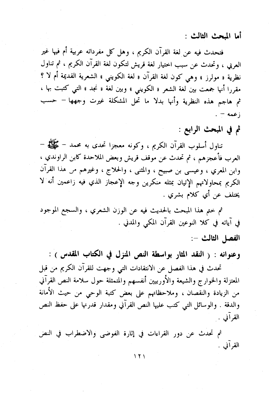 فتحدث فيه عن لغة القرآن الكريم، وهل كل مفرداته عربية أم فيها غير العربي، وتحدث عن سبب اختيار لغة قريش لتكون لغة القرآن الكريم، ثم تناول نظرية «مولرز» وهي كون لغة القرآن «لغة الكويني» الشعرية القديمة أم لا؟