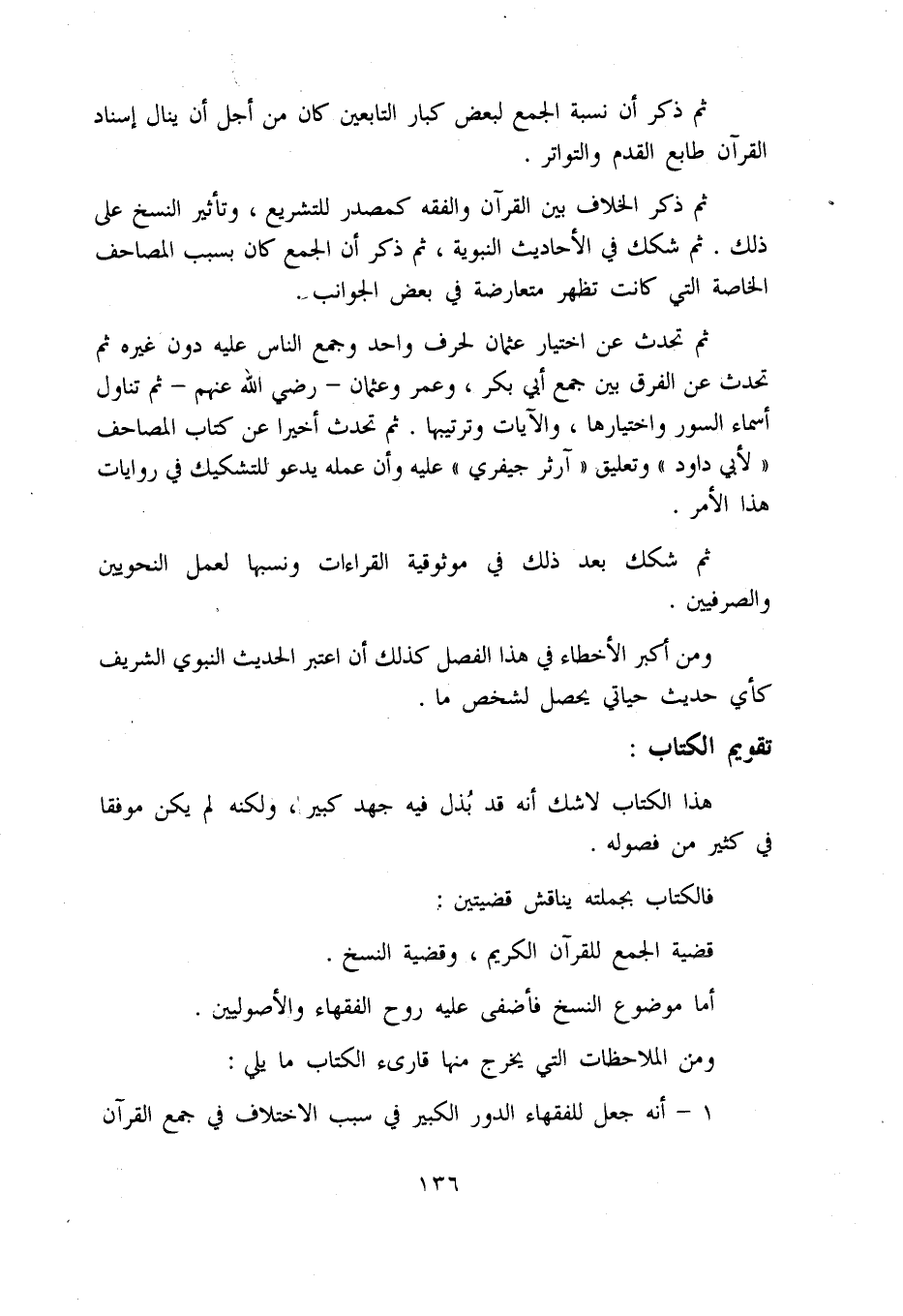 ثم تحدث عن اختيار عثمان لحرف واحد وجمع الناس عليه دون غيره ثم تحدث عن الفرق بين جمع أبي بكر، وعمر وعثمان - رضي اللّه عنهم - ثم تناول أسماء السور واختيارها، والآيات وترتيبها. ثم تحدث أخيرا عن كتاب المصاحف «لأبي داود» وتعليق «آرثر جيفري» عليه وأن عمله يدعو للتشكيك في روايات هذا الأمر.