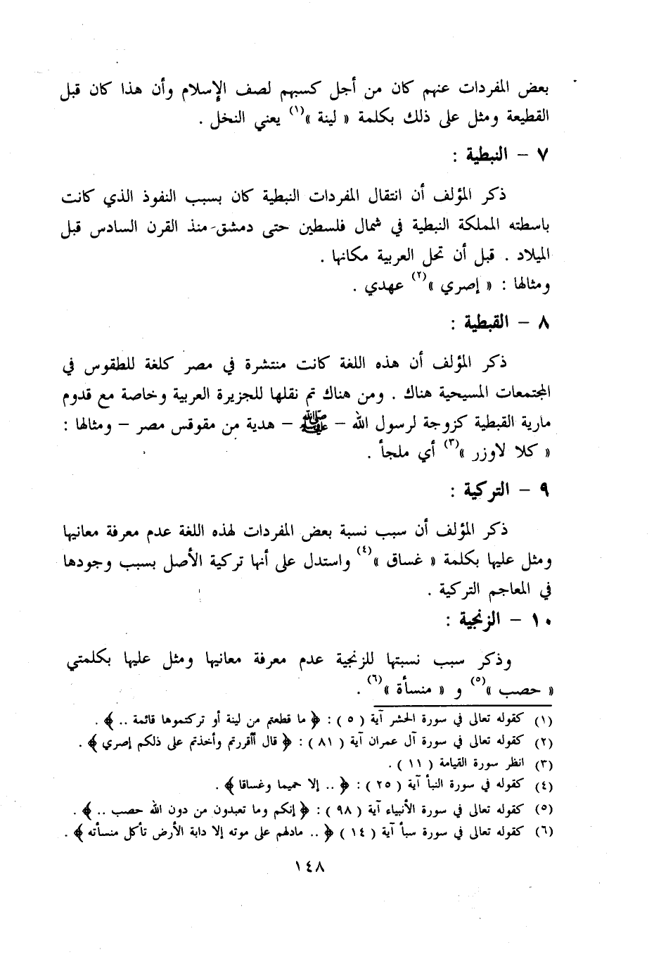 وذكر سبب نسبتها للزنجية عدم معرفة معانيها ومثل عليها بكلمتي «حصب» «5» و «منسأة» «6».