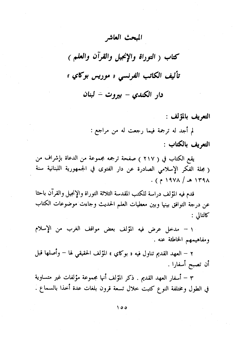 المبحث العاشر كتاب (التوراة والإنجيل والقرآن والعلم) تأليف الكاتب الفرنسي «موريس بوكاي» دار الكندي - بيروت - لبنان