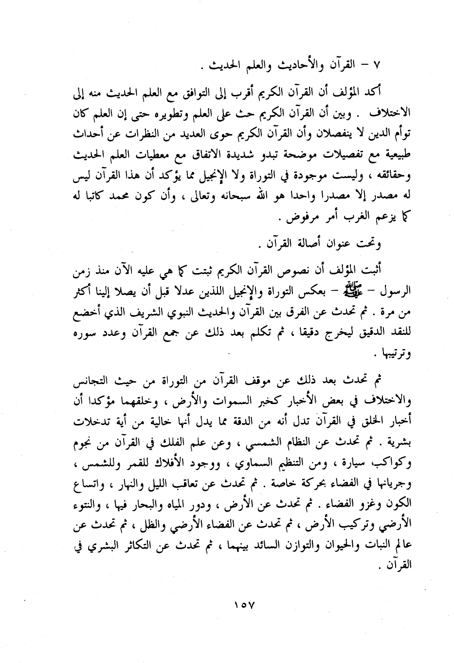 أثبت المؤلف أن نصوص القرآن الكريم ثبتت كما هي عليه الآن منذ زمن الرسول - صلّى اللّه عليه وسلّم - بعكس التوراة والإنجيل اللذين عدلا قبل أن يصلا إلينا أكثر من مرة. ثم تحدث عن الفرق بين القرآن والحديث النبوي الشريف الذي أخضع للنقد الدقيق ليخرج دقيقا، ثم تكلم بعد ذلك عن جمع القرآن وعدد سوره وترتيبها.