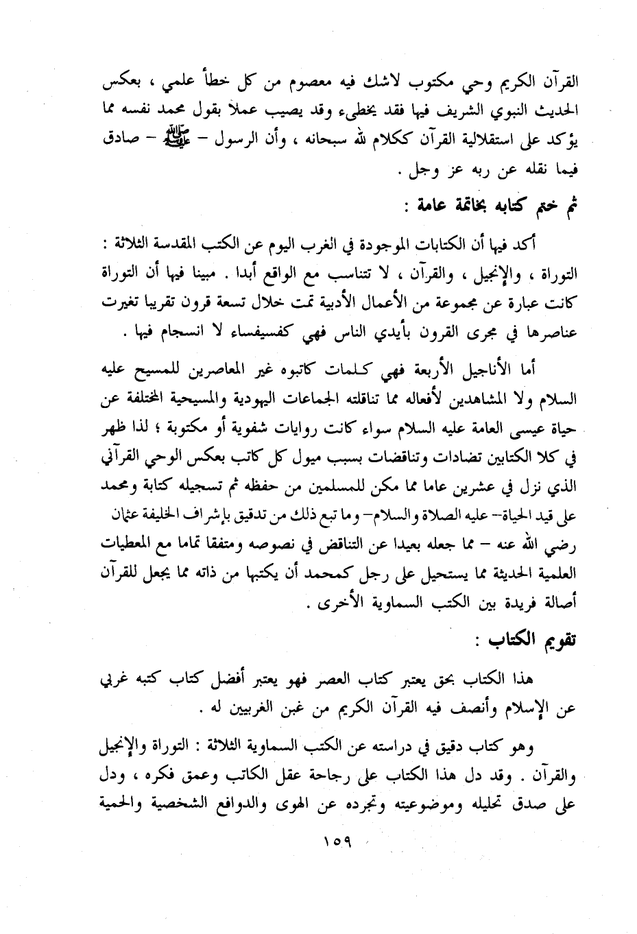 وهو كتاب دقيق في دراسته عن الكتب السماوية الثلاثة: التوراة والإنجيل والقرآن. وقد دل هذا الكتاب على رجاحة عقل الكاتب وعمق فكره، ودل على صدق تحليله وموضوعيته وتجرده عن الهوى والدوافع الشخصية والحمية