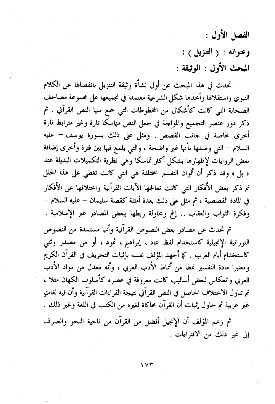 ثم تحدث عن مصادر بعض النصوص القرآنية وأنها مستمدة من النصوص التوراتية الإنجيلية كاستخدام لفظ عاد، إبراهيم، ثمود، أو من مصدر وثني كاستخدام أيام العرب. كما أجهد المؤلف نفسه بإثبات التحريف في القرآن الكريم ومعتبرا مادة التفسير نمطا من أنماط الأدب العربي، وأنه معدل من مواد الأدب العربي وانعكاس لبعض أساليب كانت معروفة في عصره كأسلوب الكهان مثلا، ثم تناول الاختلاف الحاصل في النص القرآني نتيجة القراءات القرآنية وأن فيه لغات غير عربية ثم حاول إثبات أن القرآن محاكاة لغيره من الكتب في اللغة وغير ذلك.