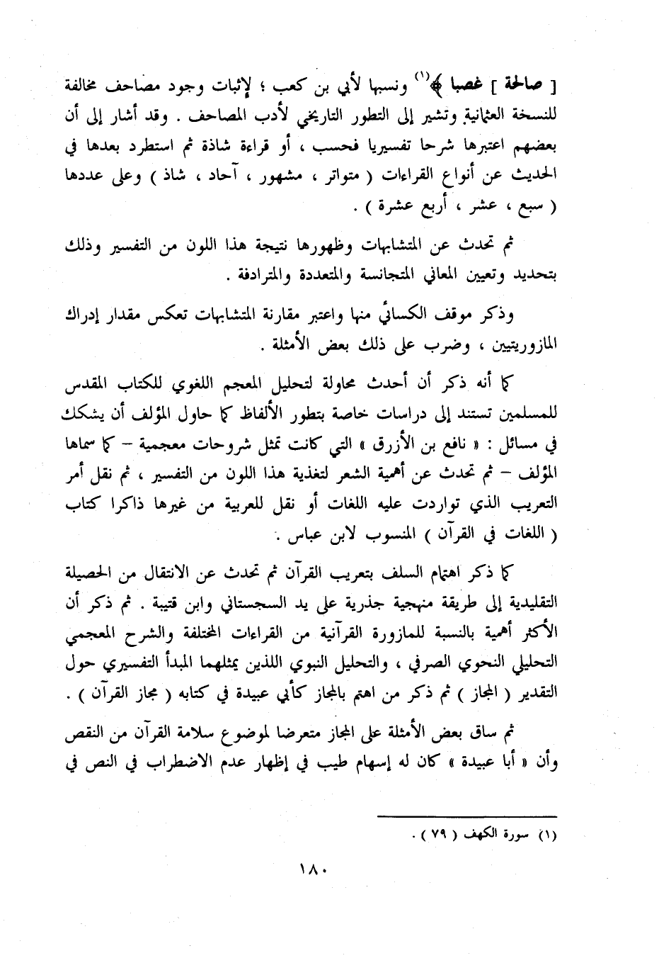 كما ذكر اهتمام السلف بتعريب القرآن ثم تحدث عن الانتقال من الحصيلة التقليدية إلى طريقة منهجية جذرية على يد السجستاني وابن قتيبة. ثم ذكر أن الأكثر أهمية بالنسبة للمازورة القرآنية من القراءات المختلفة والشرح المعجمي التحليلي النحوي الصرفي، والتحليل النبوي اللذين يمثلهما المبدأ التفسيري حول التقدير (المجاز) ثم ذكر من اهتم بالمجاز كأبي عبيدة في كتابه (مجاز القرآن).