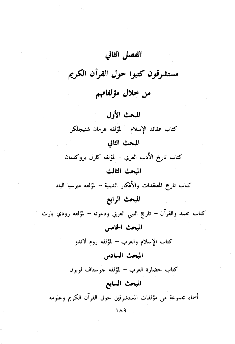 الفصل الثاني مستشرقون كتبوا حول القرآن الكريم من خلال مؤلفاتهم المبحث الأول كتاب عقائد الإسلام - لمؤلفه هرمان شتيجلكر المبحث الثاني كتاب تاريخ الأدب العربي - لمؤلفه كارل بروكلمان المبحث الثالث كتاب تاريخ المعتقدات والأفكار الدينية - لمؤلفه ميرسيا الياد المبحث الرابع كتاب محمد والقرآن - تاريخ النبي العربي ودعوته - لمؤلفه رودي بارت المبحث الخامس كتاب الإسلام والعرب - لمؤلفه روم لاندو المبحث السادس كتاب حضارة العرب - لمؤلفه جوستاف لوبون المبحث السابع أسماء مجموعة من مؤلفات المستشرقين حول القرآن الكريم وعلومه