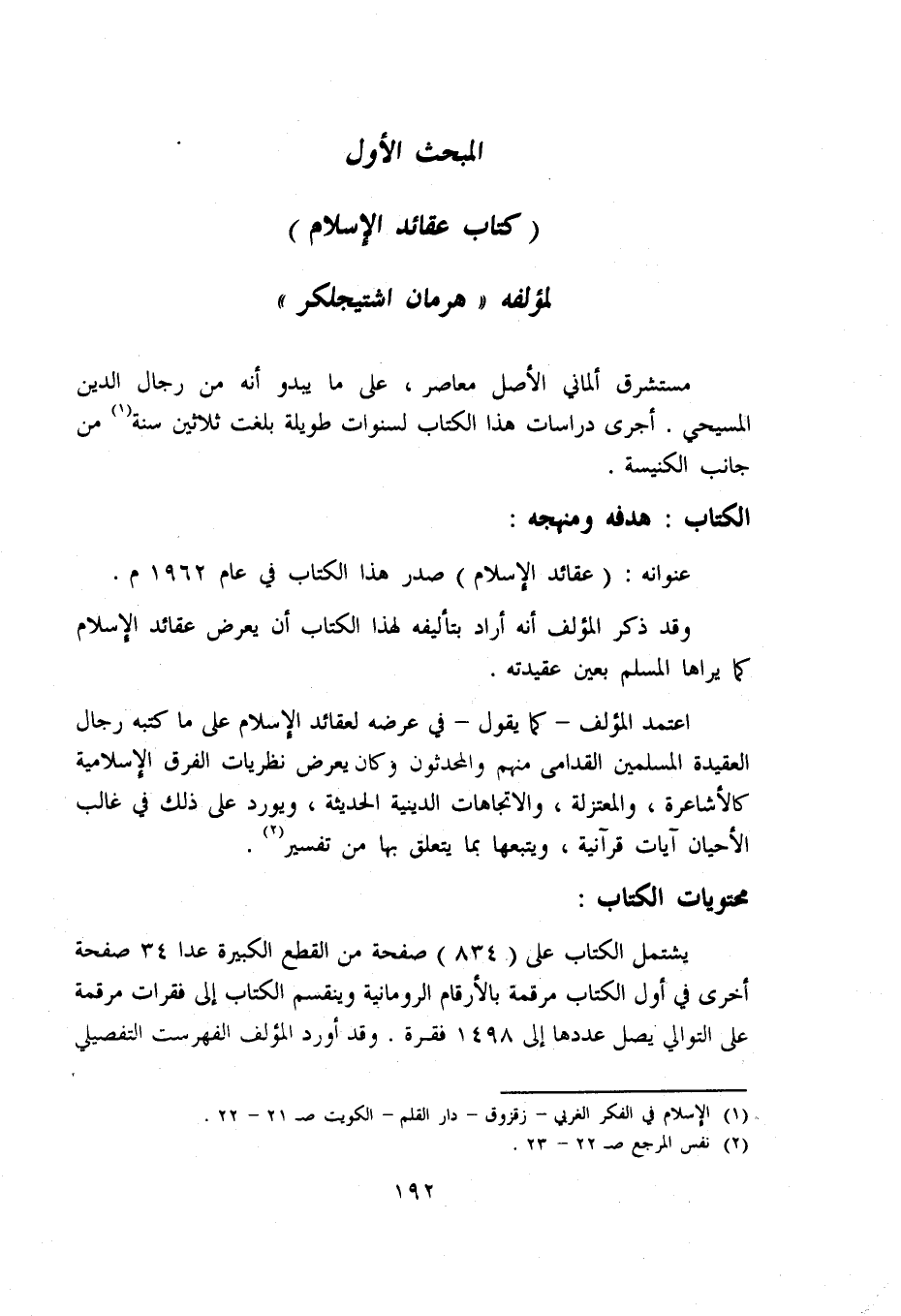 المبحث الأول (كتاب عقائد الإسلام) لمؤلفه «هرمان اشتيجلكر»