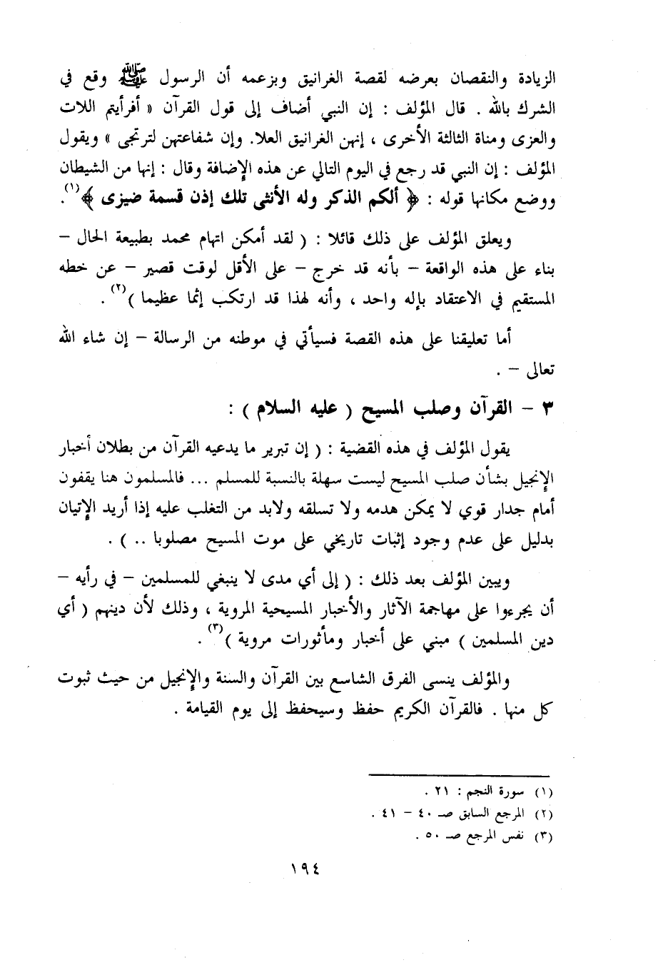 الزيادة والنقصان بعرضه لقصة الغرانيق وبزعمه أن الرسول صلّى اللّه عليه وسلّم وقع في الشرك باللّه. قال المؤلف: إن النبي أضاف إلى قول القرآن «أ فرأيتم اللات والعزى ومناة الثالثة الأخرى، إنهن الغرانيق العلا. وإن شفاعتهن لترتجى» ويقول المؤلف: إن النبي قد رجع في اليوم التالي عن هذه الإضافة وقال: إنها من الشيطان ووضع مكانها قوله: أَلَكُمُ الذَّكَرُ ولَهُ الْأُنْثى تِلْكَ إِذاً قِسْمَةٌ ضِيزى «1».