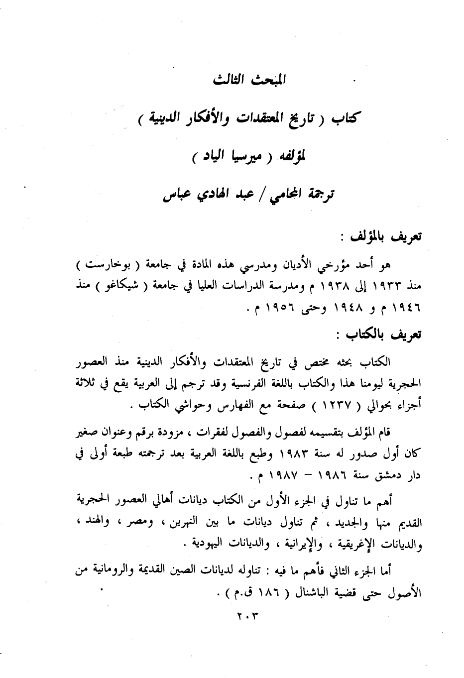 المبحث الثالث كتاب (تاريخ المعتقدات والأفكار الدينية) لمؤلفه (ميرسيا الياد) ترجمة المحامي/ عبد الهادي عباس