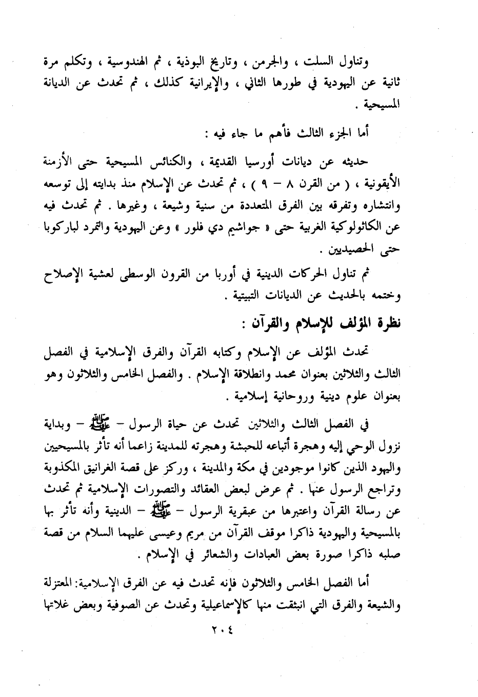 في الفصل الثالث والثلاثين تحدث عن حياة الرسول - صلّى اللّه عليه وسلّم - وبداية نزول الوحي إليه وهجرة أتباعه للحبشة وهجرته للمدينة زاعما أنه تأثر بالمسيحيين واليهود الذين كانوا موجودين في مكة والمدينة، وركز على قصة الغرانيق المكذوبة وتراجع الرسول عنها. ثم عرض لبعض العقائد والتصورات الإسلامية ثم تحدث عن رسالة القرآن واعتبرها من عبقرية الرسول - صلّى اللّه عليه وسلّم - الدينية وأنه تأثر بها بالمسيحية واليهودية ذاكرا موقف القرآن من مريم وعيسى عليهما السلام من قصة صلبه ذاكرا صورة بعض العبادات والشعائر في الإسلام.