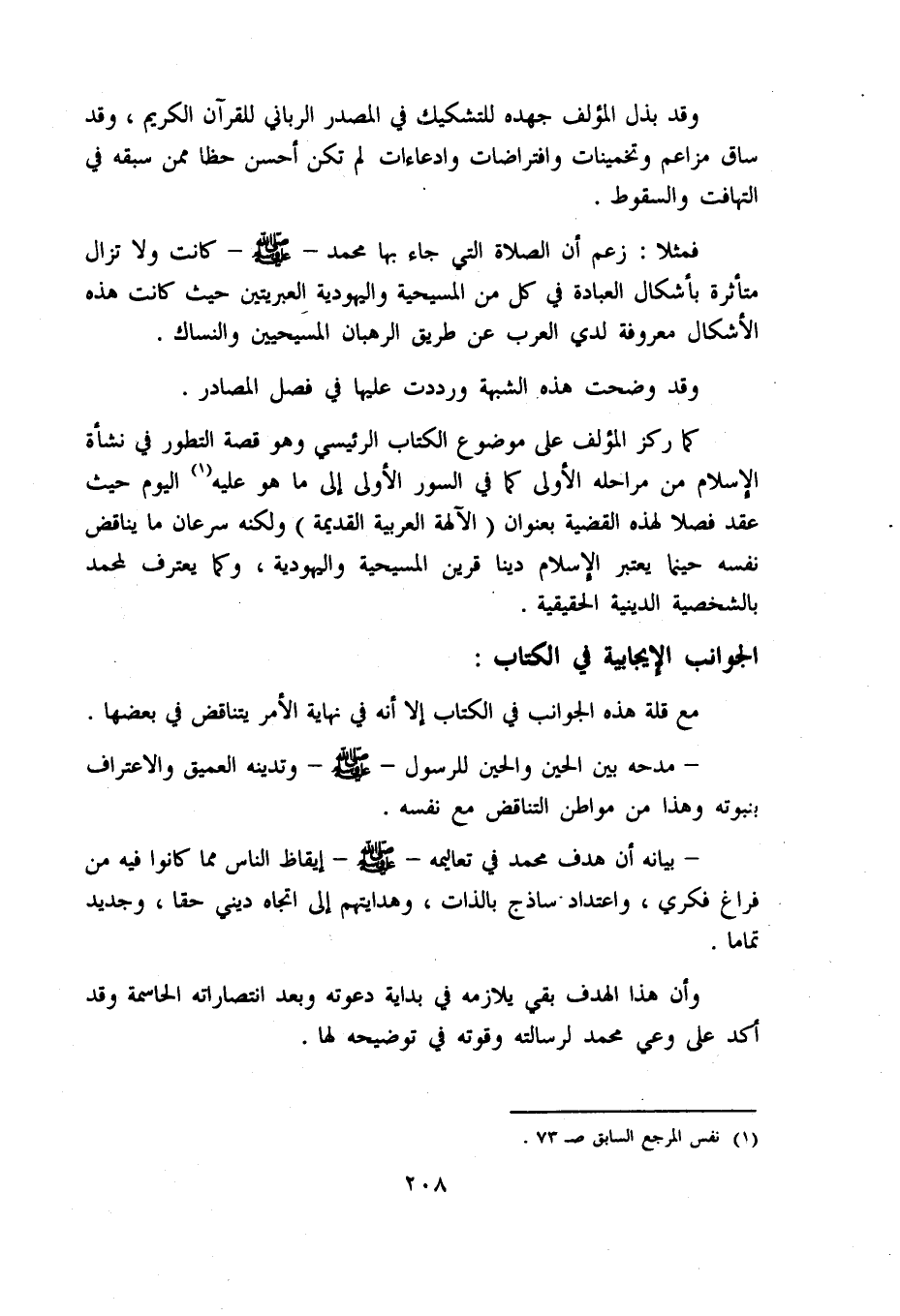 - بيانه أن هدف محمد في تعاليمه - صلّى اللّه عليه وسلّم - إيقاظ الناس مما كانوا فيه من فراغ فكري، واعتداد ساذج بالذات، وهدايتهم إلى اتجاه ديني حقا، وجديد تماما.