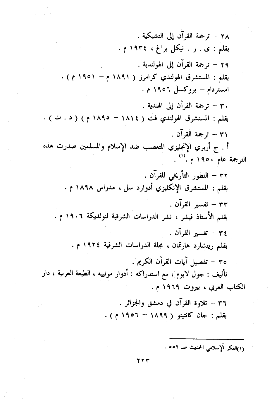 31 - ترجمة القرآن. أ. ج أربري الإنجليزي المتعصب ضد الإسلام والمسلمين صدرت هذه الترجمة عام 1950 م. «1».