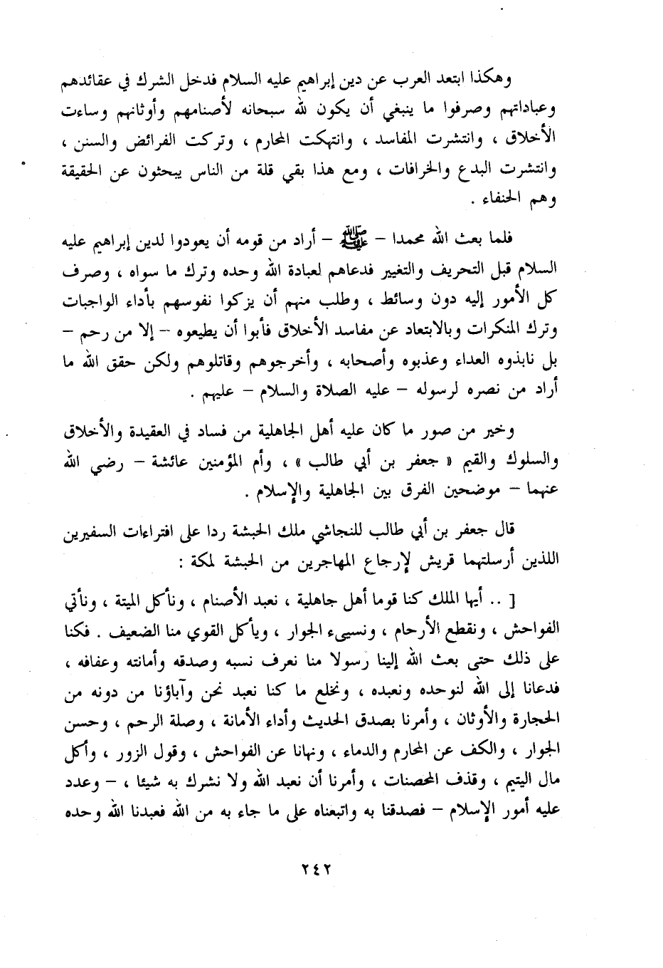 [ .. أيها الملك كنا قوما أهل جاهلية، نعبد الأصنام، ونأكل الميتة، ونأتي الفواحش، ونقطع الأرحام، ونسيئ الجوار، ويأكل القوي منا الضعيف. فكنا على ذلك حتى بعث اللّه إلينا رسولا منا نعرف نسبه وصدقه وأمانته وعفافه، فدعانا إلى اللّه لنوحده ونعبده، ونخلع ما كنا نعبد نحن وآباؤنا من دونه من الحجارة والأوثان، وأمرنا بصدق الحديث وأداء الأمانة، وصلة الرحم، وحسن الجوار، والكف عن المحارم والدماء، ونهانا عن الفواحش، وقول الزور، وأكل مال اليتيم، وقذف المحصنات، وأمرنا أن نعبد اللّه ولا نشرك به شيئا، - وعدد عليه أمور الإسلام - فصدقنا به واتبعناه على ما جاء به من اللّه فعبدنا اللّه وحده