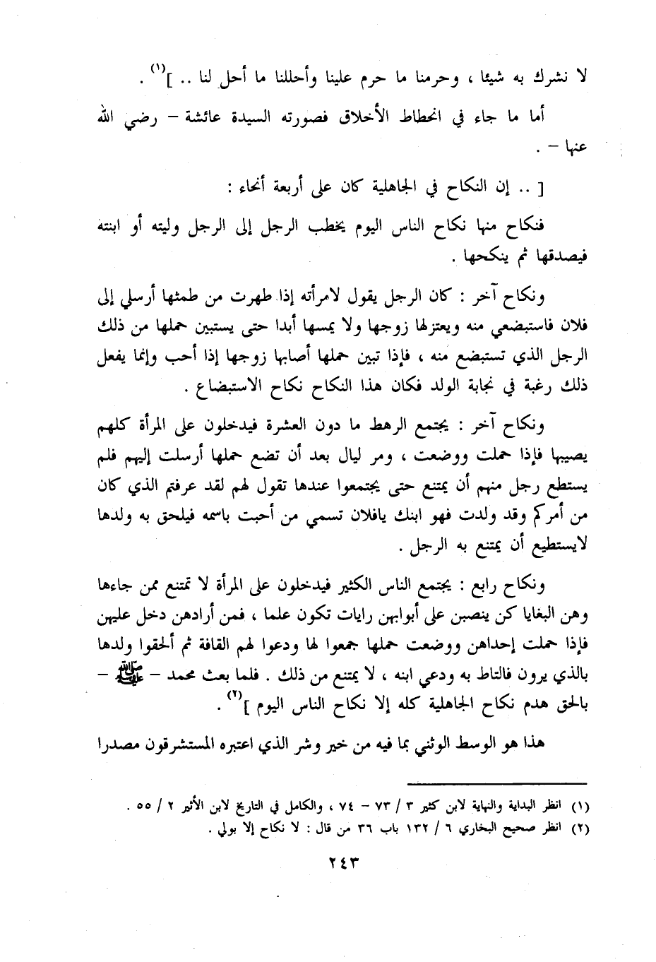 ونكاح رابع: يجتمع الناس الكثير فيدخلون على المرأة لا تمتنع ممن جاءها وهن البغايا كن ينصبن على أبوابهن رايات تكون علما، فمن أرادهن دخل عليهن فإذا حملت إحداهن ووضعت حملها جمعوا لها ودعوا لهم القافة ثم ألحقوا ولدها بالذي يرون فالتاط به ودعي ابنه، لا يمتنع من ذلك. فلما بعث محمد - صلّى اللّه عليه وسلّم - بالحق هدم نكاح الجاهلية كله إلا نكاح الناس اليوم] «2».