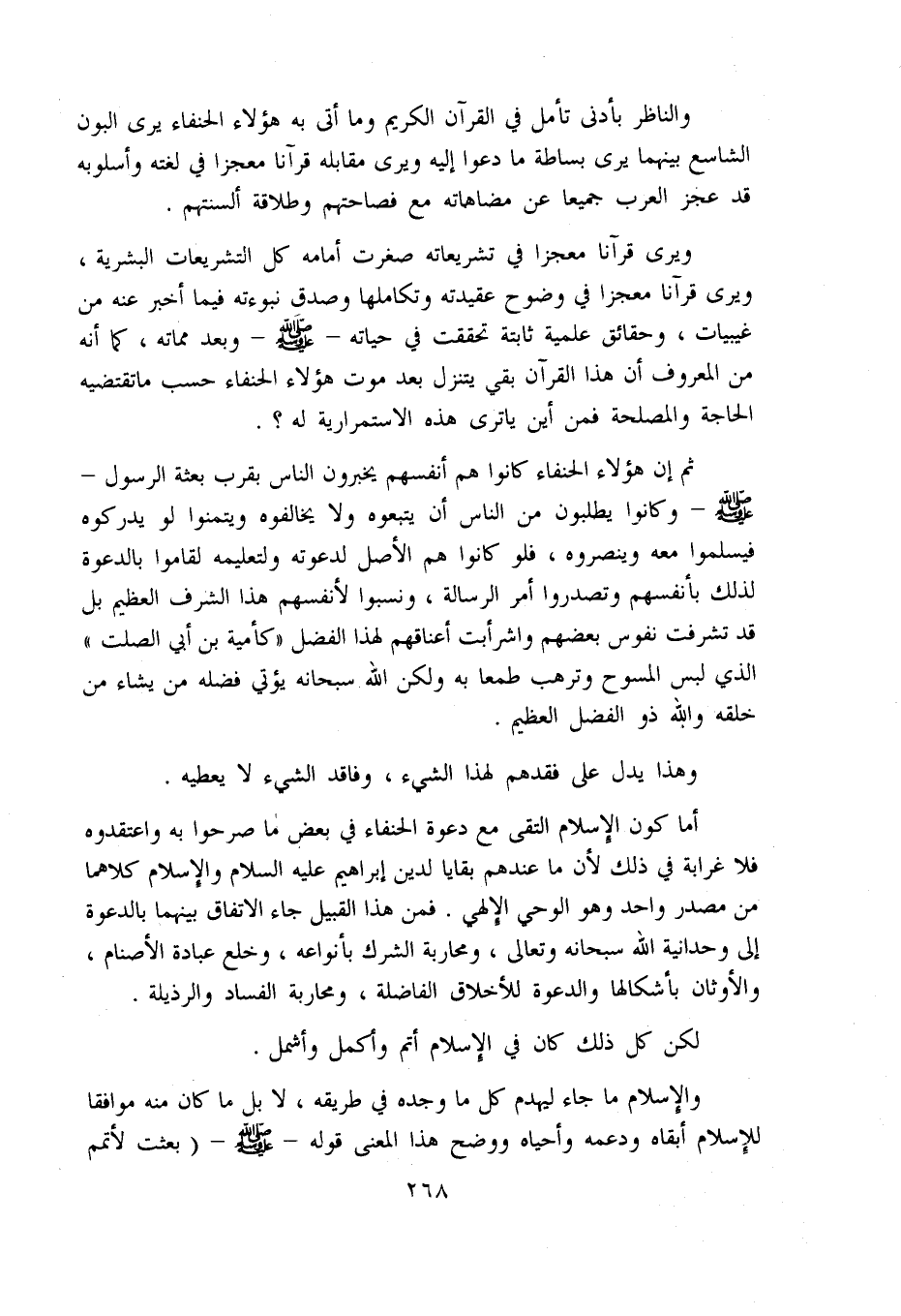 ويرى قرآنا معجزا في تشريعاته صغرت أمامه كل التشريعات البشرية، ويرى قرآنا معجزا في وضوح عقيدته وتكاملها وصدق نبوءته فيما أخبر عنه من غيبيات، وحقائق علمية ثابتة تحققت في حياته - صلّى اللّه عليه وسلّم - وبعد مماته، كما أنه من المعروف أن هذا القرآن بقي يتنزل بعد موت هؤلاء الحنفاء حسب ما تقتضيه الحاجة والمصلحة فمن أين يا ترى هذه الاستمرارية له؟.