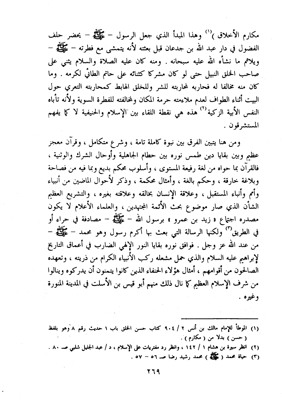 مكارم الأخلاق) «1» وهذا المبدأ الذي جعل الرسول - صلّى اللّه عليه وسلّم - يحضر حلف الفضول في دار عبد اللّه بن جدعان قبل بعثته لأنه يتمشى مع فطرته - صلّى اللّه عليه وسلّم - ويلائم ما نشأه اللّه عليه سبحانه. ومنه كان عليه الصلاة والسلام يثني على صاحب الخلق النبيل حتى لو كان مشركا كثنائه على حاتم الطائي لكرمه. وما كان منه مخالفا له فحاربه لمحاربته للشر وللخلق الهابط كمحاربته التعري حول البيت أثناء الطواف لعدم ملاءمته حرمة المكان ولمخالفته للفطرة السوية ولأنه تأباه النفس الأبية الزكية «2» هذه هي نقطة اللقاء بين الإسلام والحنيفية لا كما يفهم المستشرقون.