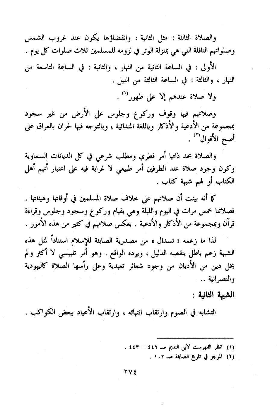 لذا ما زعمه «تسدال» من مصدرية الصابئة للإسلام استنادا لمثل هذه الشبهة زعم باطل ينقصه الدليل، ويرده الواقع. وهو أمر تلبيسي لا أكثر ولم يخل دين من الأديان من وجود شعائر تعبدية وعلى رأسها الصلاة كاليهودية والنصرانية ..