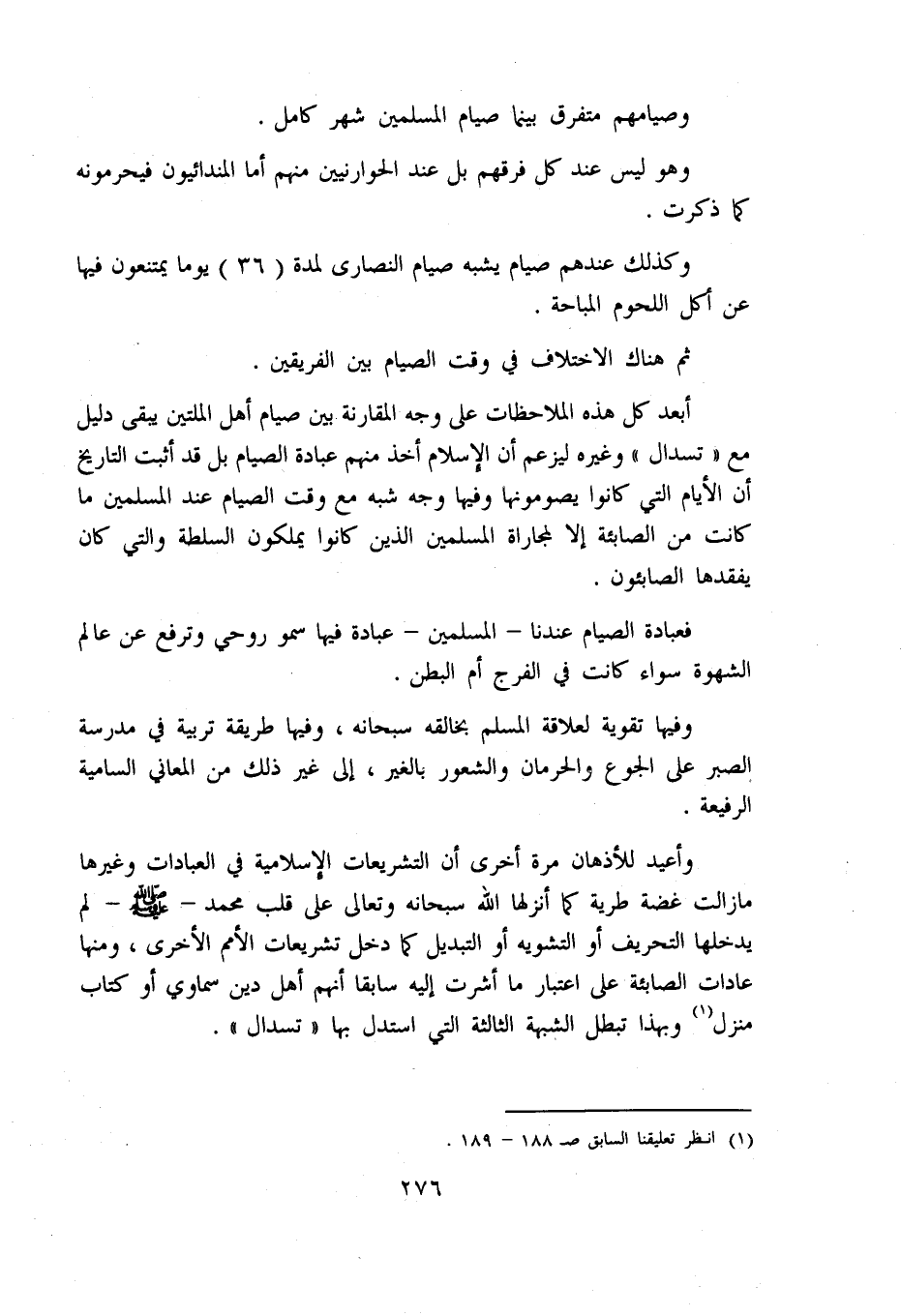 وأعيد للأذهان مرة أخرى أن التشريعات الإسلامية في العبادات وغيرها ما زالت غضة طرية كما أنزلها اللّه سبحانه وتعالى على قلب محمد - صلّى اللّه عليه وسلّم - لم يدخلها التحريف أو التشويه أو التبديل كما دخل تشريعات الأمم الأخرى، ومنها عادات الصابئة على اعتبار ما أشرت إليه سابقا أنهم أهل دين سماوي أو كتاب منزل «1» وبهذا تبطل الشبهة الثالثة التي استدل بها «تسدال».