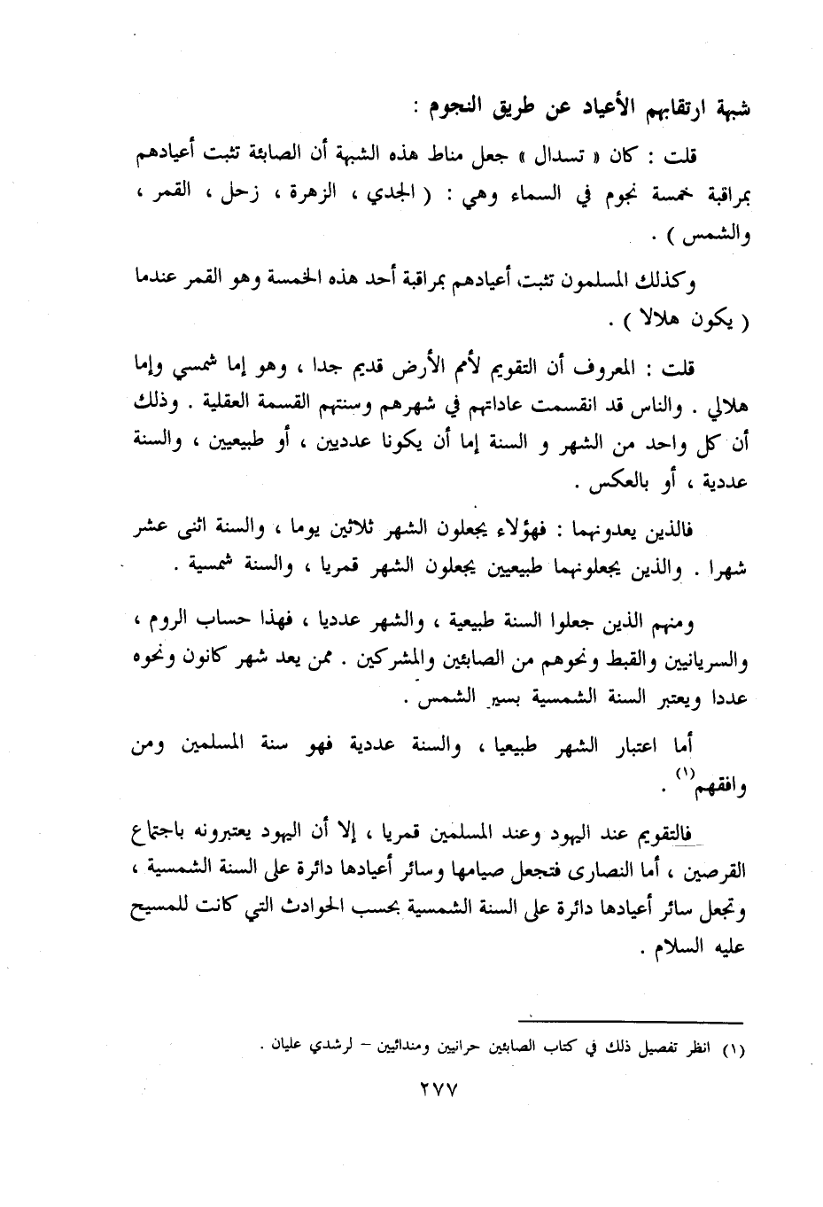 قلت: كان «تسدال» جعل مناط هذه الشبهة أن الصابئة تثبت أعيادهم بمراقبة خمسة نجوم في السماء وهي: (الجدي، الزهرة، زحل، القمر، والشمس).