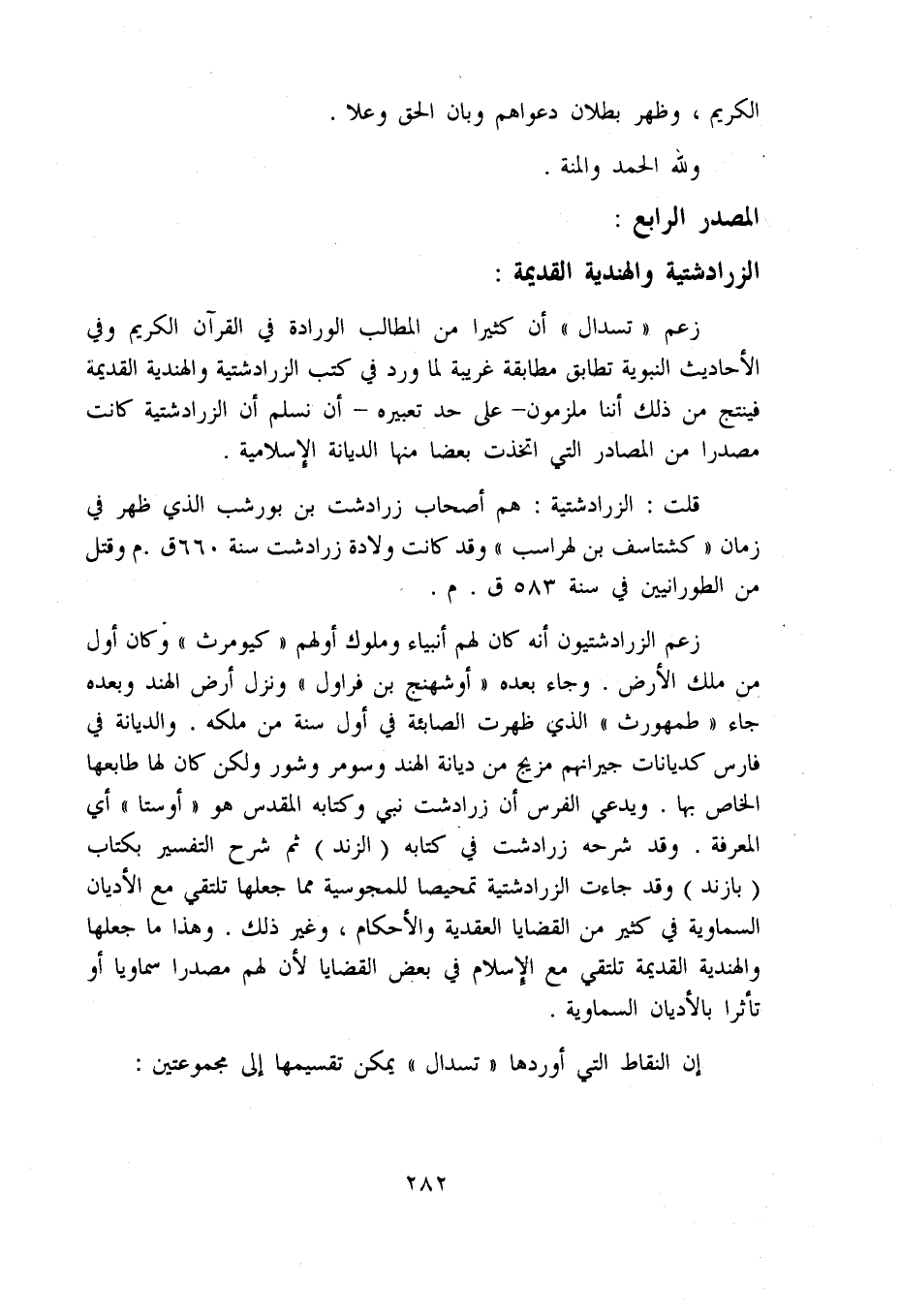 قلت: الزرادشتية: هم أصحاب زرادشت بن بورشب الذي ظهر في زمان «كشتاسف بن لهراسب» وقد كانت ولادة زرادشت سنة 660 ق. م وقتل من الطورانيين في سنة 583 ق. م.