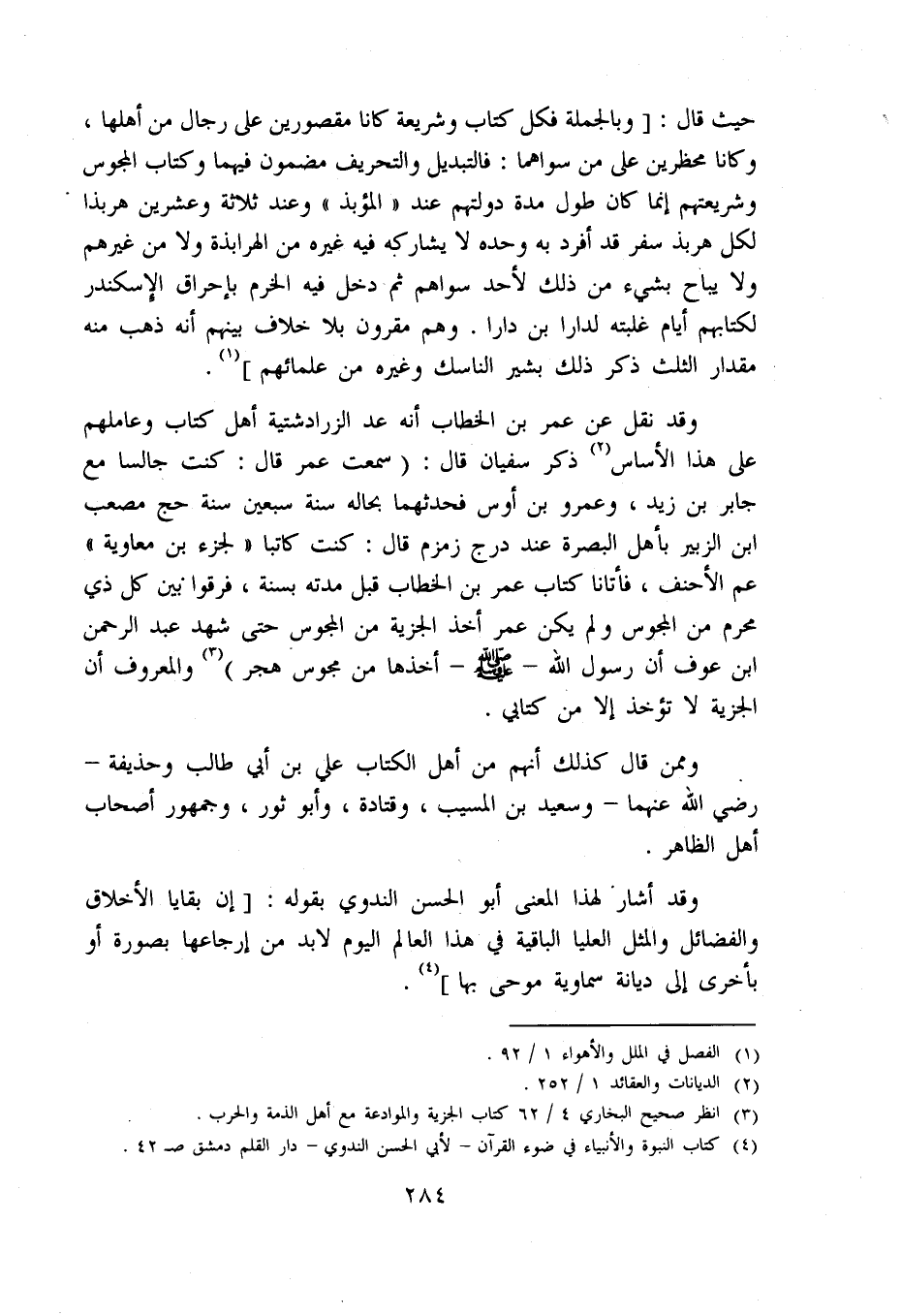وقد نقل عن عمر بن الخطاب أنه عد الزرادشتية أهل كتاب وعاملهم على هذا الأساس «2» ذكر سفيان قال: (سمعت عمر قال: كنت جالسا مع جابر بن زيد، وعمرو بن أوس فحدثهما بحاله سنة سبعين سنة حج مصعب ابن الزبير بأهل البصرة عند درج زمزم قال: كنت كاتبا «لجزء بن معاوية» عم الأحنف، فأتانا كتاب عمر بن الخطاب قبل مدته بسنة، فرقوا بين كل ذي محرم من المجوس ولم يكن عمر أخذ الجزية من المجوس حتى شهد عبد الرحمن ابن عوف أن رسول اللّه - صلّى اللّه عليه وسلّم - أخذها من مجوس هجر) «3» والمعروف أن الجزية لا تؤخذ إلا من كتابي.