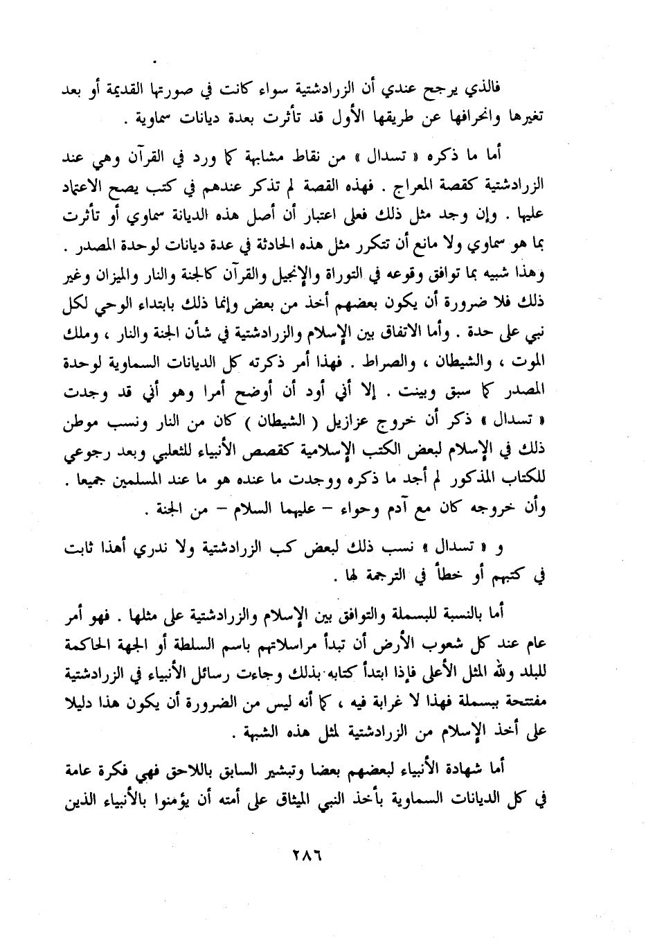 وهذا شبيه بما توافق وقوعه في التوراة والإنجيل والقرآن كالجنة والنار والميزان وغير ذلك فلا ضرورة أن يكون بعضهم أخذ من بعض وإنما ذلك بابتداء الوحي لكل نبي على حدة. وأما الاتفاق بين الإسلام والزرادشتية في شأن الجنة والنار، وملك الموت، والشيطان، والصراط. فهذا أمر ذكرته كل الديانات السماوية لوحدة المصدر كما سبق وبينت. إلا أني أود أن أوضح أمرا وهو أني قد وجدت «تسدال» ذكر أن خروج عزازيل (الشيطان) كان من النار ونسب موطن ذلك في الإسلام لبعض الكتب الإسلامية كقصص الأنبياء للثعلبي وبعد رجوعي للكتاب المذكور لم أجد ما ذكره ووجدت ما عنده هو ما عند المسلمين جميعا.