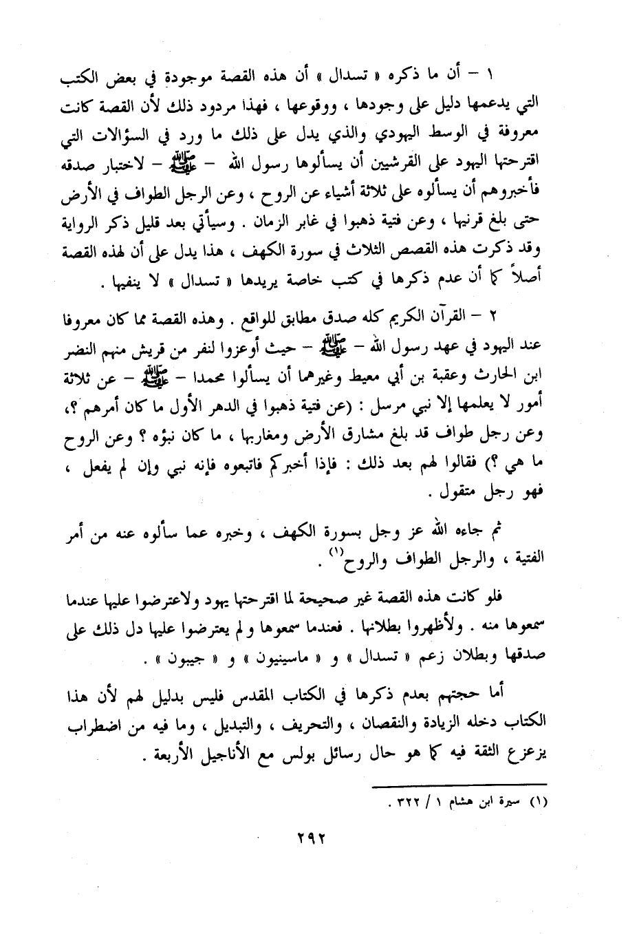 1 - أن ما ذكره «تسدال» أن هذه القصة موجودة في بعض الكتب التي يدعمها دليل على وجودها، ووقوعها، فهذا مردود ذلك لأن القصة كانت معروفة في الوسط اليهودي والذي يدل على ذلك ما ورد في السؤالات التي اقترحتها اليهود على القرشيين أن يسألوها رسول اللّه - صلّى اللّه عليه وسلّم - لاختبار صدقه فأخبروهم أن يسألوه على ثلاثة أشياء عن الروح، وعن الرجل الطواف في الأرض حتى بلغ قرنيها، وعن فتية ذهبوا في غابر الزمان. وسيأتي بعد قليل ذكر الرواية وقد ذكرت هذه القصص الثلاث في سورة الكهف، هذا يدل على أن لهذه القصة أصلا كما أن عدم ذكرها في كتب خاصة يريدها «تسدال» لا ينفيها.