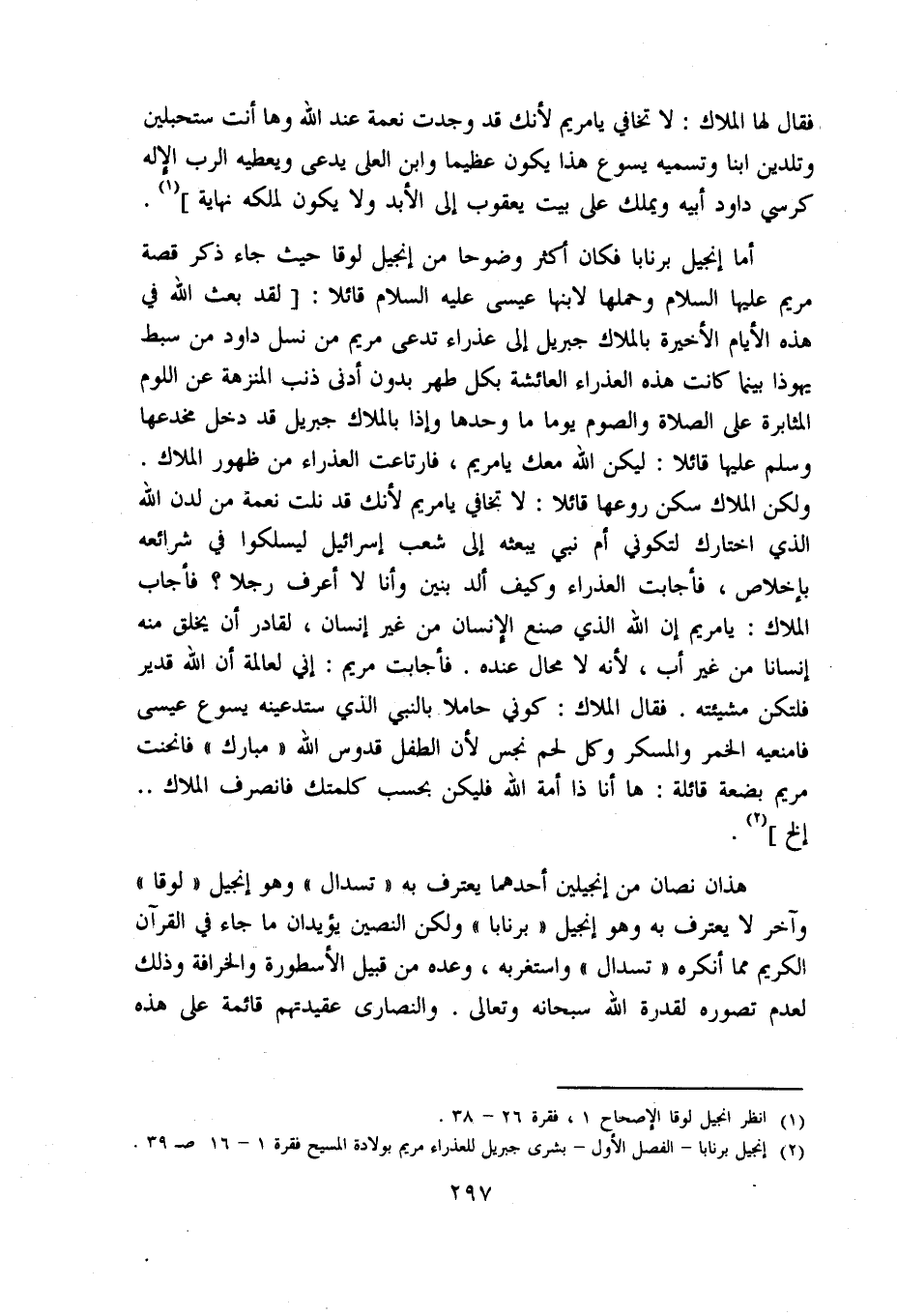 هذان نصان من إنجيلين أحدهما يعترف به «تسدال» وهو إنجيل «لوقا» وآخر لا يعترف به وهو إنجيل «برنابا» ولكن النصين يؤيدان ما جاء في القرآن الكريم مما أنكره «تسدال» واستغربه، وعده من قبيل الأسطورة والخرافة وذلك لعدم تصوره لقدرة اللّه سبحانه وتعالى. والنصارى عقيدتهم قائمة على هذه