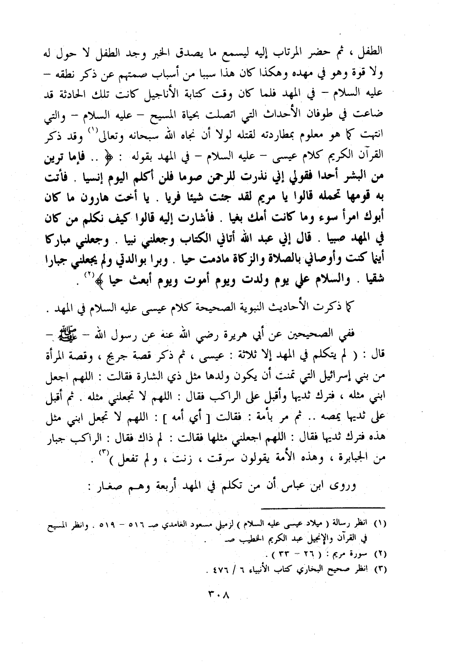 الطفل، ثم حضر المرتاب إليه ليسمع ما يصدق الخبر وجد الطفل لا حول له ولا قوة وهو في مهده وهكذا كان هذا سببا من أسباب صمتهم عن ذكر نطقه - عليه السلام - في المهد فلما كان وقت كتابة الأناجيل كانت تلك الحادثة قد ضاعت في طوفان الأحداث التي اتصلت بحياة المسيح - عليه السلام - والتي انتهت كما هو معلوم بمطاردته لقتله لو لا أن نجاه اللّه سبحانه وتعالى «1» وقد ذكر القرآن الكريم كلام عيسى - عليه السلام - في المهد بقوله: .. فَإِمَّا تَرَيِنَّ مِنَ الْبَشَرِ أَحَداً فَقُولِي إِنِّي نَذَرْتُ لِلرَّحْمنِ صَوْماً فَلَنْ أُكَلِّمَ الْيَوْمَ إِنْسِيًّا. فَأَتَتْ بِهِ قَوْمَها تَحْمِلُهُ قالُوا يا مَرْيَمُ لَقَدْ جِئْتِ شَيْئاً فَرِيًّا. يا أُخْتَ هارُونَ ما كانَ أَبُوكِ امْرَأَ سَوْءٍ وما كانَتْ أُمُّكِ بَغِيًّا. فَأَشارَتْ إِلَيْهِ قالُوا كَيْفَ نُكَلِّمُ مَنْ كانَ فِي الْمَهْدِ صَبِيًّا. قالَ إِنِّي عَبْدُ اللَّهِ آتانِيَ الْكِتابَ وجَعَلَنِي نَبِيًّا. وجَعَلَنِي مُبارَكاً أَيْنَ ما كُنْتُ وأَوْصانِي بِالصَّلاةِ والزَّكاةِ ما دُمْتُ حَيًّا. وبَرًّا بِوالِدَتِي ولَمْ يَجْعَلْنِي جَبَّاراً شَقِيًّا. والسَّلامُ عَلَيَّ يَوْمَ وُلِدْتُ ويَوْمَ أَمُوتُ ويَوْمَ أُبْعَثُ حَيًّا «2».