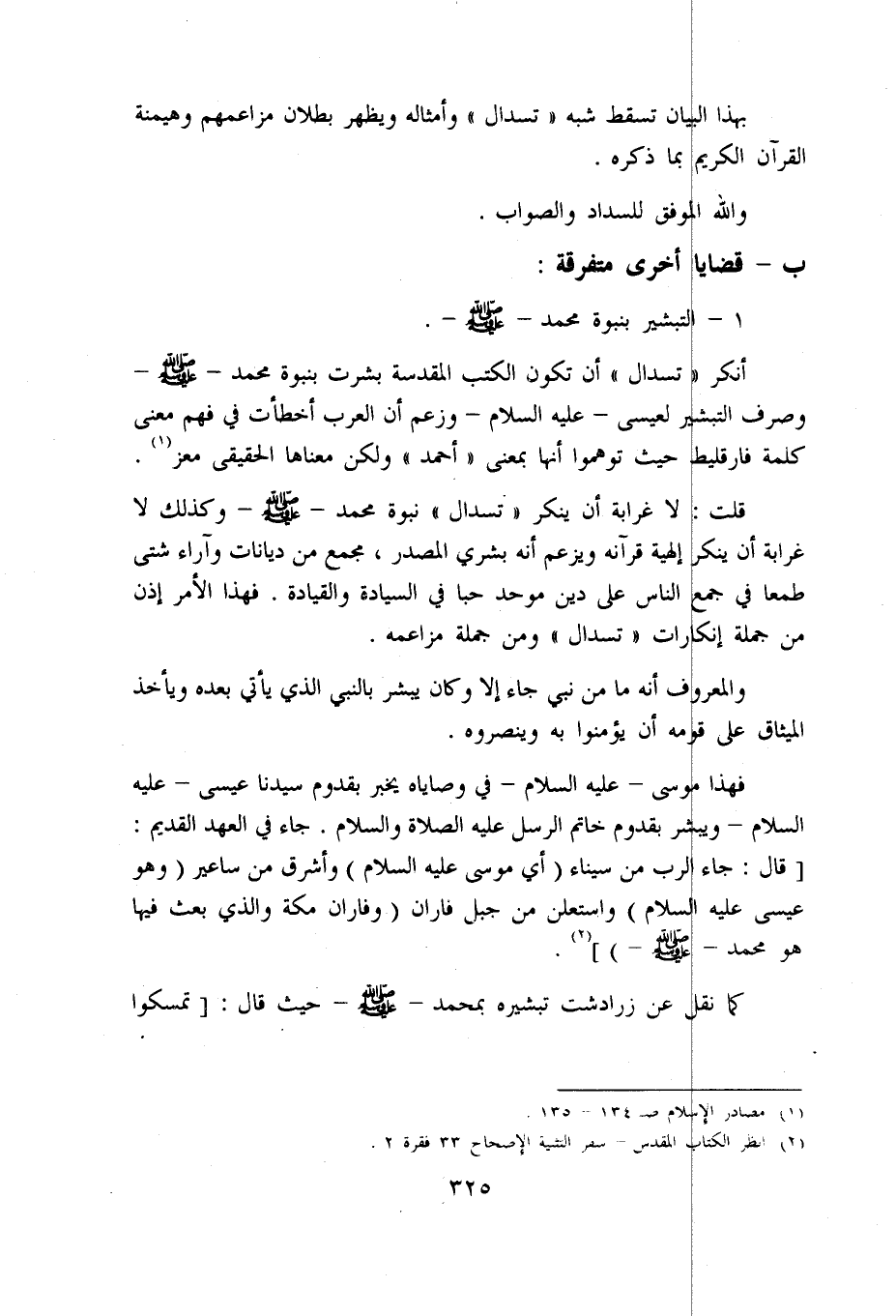 أنكر «تسدال» أن تكون الكتب المقدسة بشرت بنبوة محمد - صلّى اللّه عليه وسلّم - وصرف التبشير لعيسى - عليه السلام - وزعم أن العرب أخطأت في فهم معنى كلمة فارقليط حيث توهموا أنها بمعنى «أحمد» ولكن معناها الحقيقى معز «1».