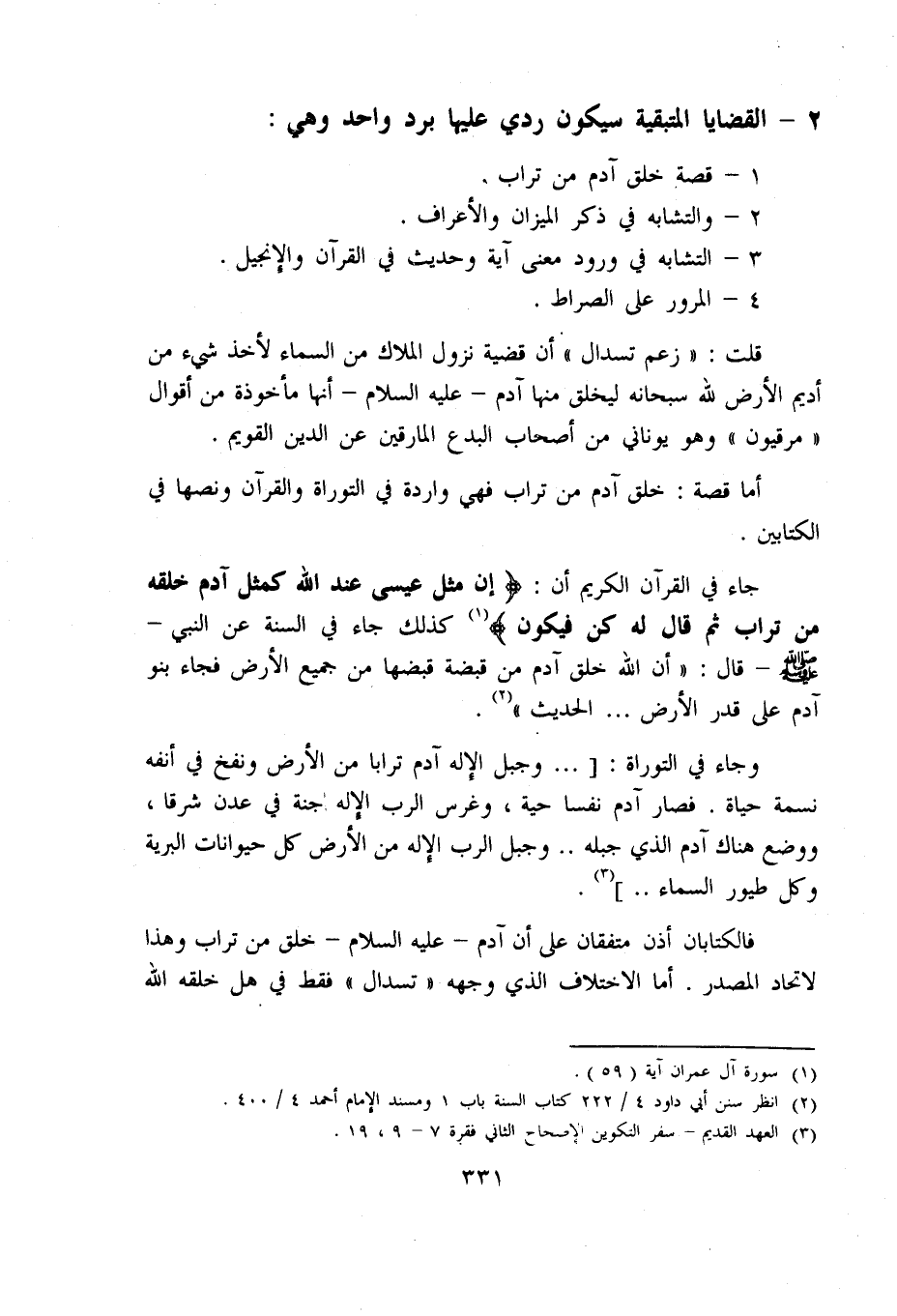فالكتابان أذن متفقان على أن آدم - عليه السلام - خلق من تراب وهذا لاتحاد المصدر. أما الاختلاف الذي وجهه «تسدال» فقط في هل خلقه اللّه