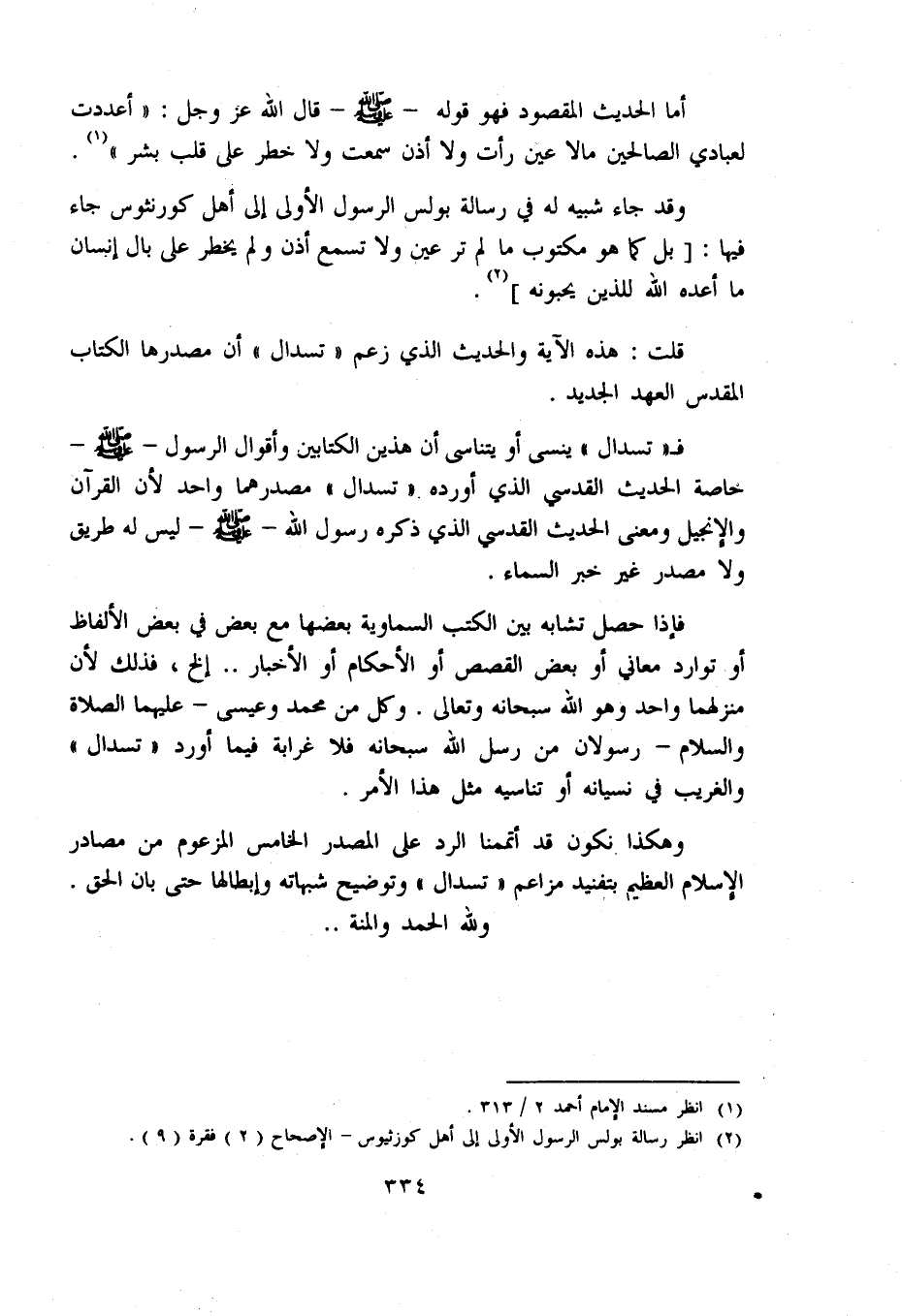 ف «تسدال» ينسى أو يتناسى أن هذين الكتابين وأقوال الرسول - صلّى اللّه عليه وسلّم - خاصة الحديث القدسي الذي أورده «تسدال» مصدرهما واحد لأن القرآن والإنجيل ومعنى الحديث القدسي الذي ذكره رسول اللّه - صلّى اللّه عليه وسلّم - ليس له طريق ولا مصدر غير خبر السماء.