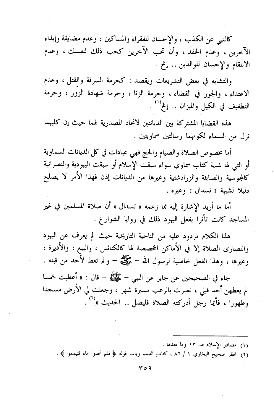 أما بخصوص الصلاة والصيام والحج فهي عبادات في كل الديانات السماوية أو التي لها شبهة كتاب سماوي سواء سبقت الإسلام أو سبقت اليهودية والنصرانية كالمجوسية والصابئة والزرادشتية وغيرها من الديانات إذن فهذا الأمر لا يصلح دليلا لشبهة «تسدال» وغيره.