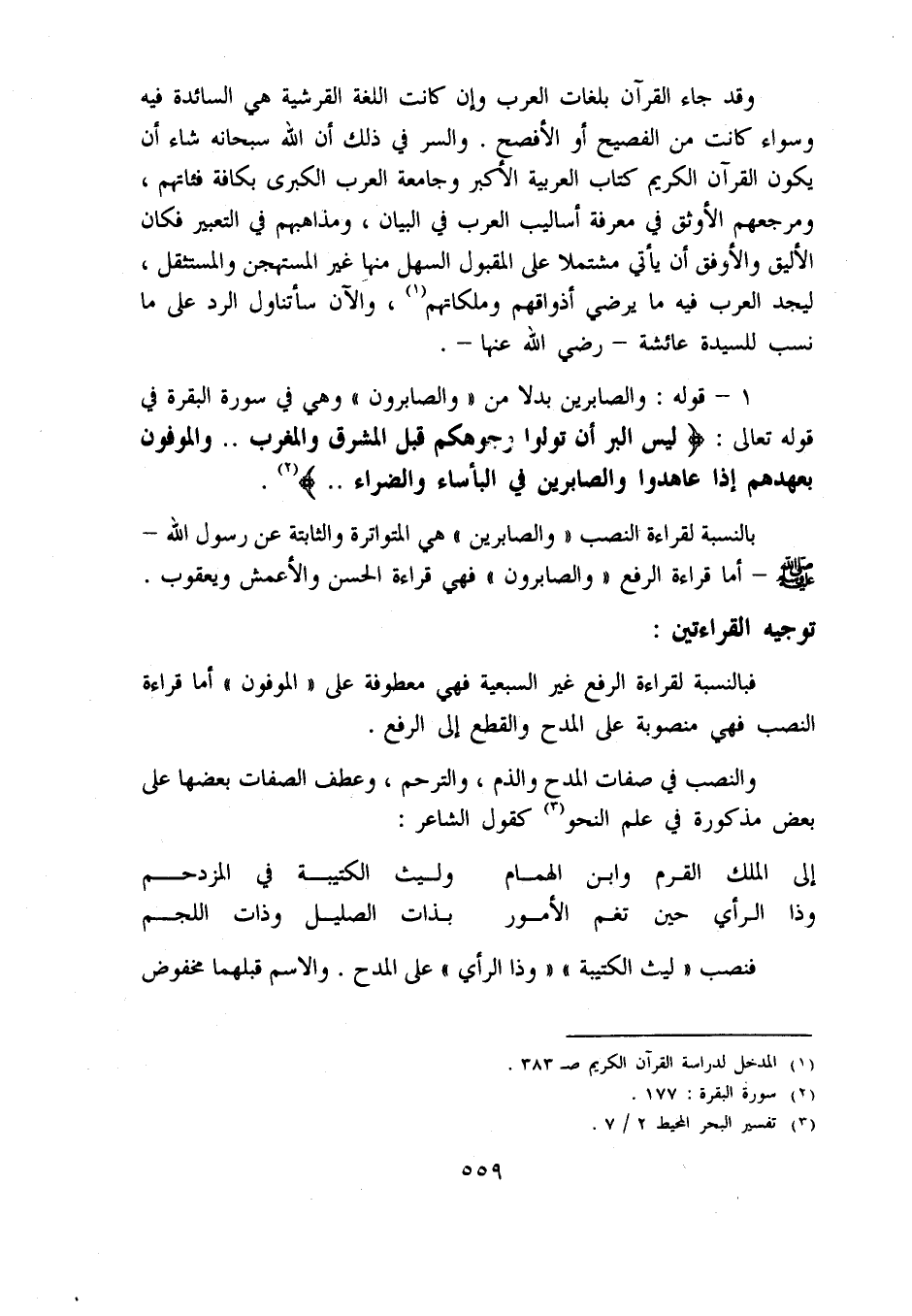 1 - قوله: والصابرين بدلا من «والصابرون» وهي في سورة البقرة في قوله تعالى: لَيْسَ الْبِرَّ أَنْ تُوَلُّوا وُجُوهَكُمْ قِبَلَ الْمَشْرِقِ والْمَغْرِبِ .. والْمُوفُونَ بِعَهْدِهِمْ إِذا عاهَدُوا والصَّابِرِينَ فِي الْبَاساءِ والضَّرَّاءِ .. «2».