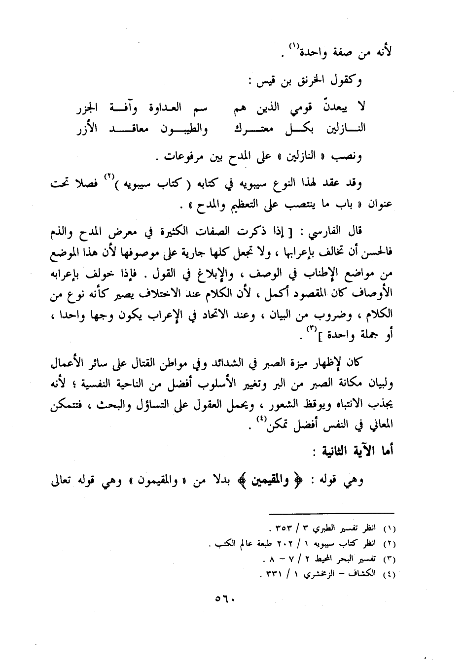 قال الفارسي: [إذا ذكرت الصفات الكثيرة في معرض المدح والذم فالحسن أن تخالف بإعرابها، ولا تجعل كلها جارية على موصوفها لأن هذا الموضع من مواضع الإطناب في الوصف، والإبلاغ في القول. فإذا خولف بإعرابه الأوصاف كان المقصود أكمل، لأن الكلام عند الاختلاف يصير كأنه نوع من الكلام، وضروب من البيان، وعند الاتحاد في الإعراب يكون وجها واحدا، أو جملة واحدة] «3».