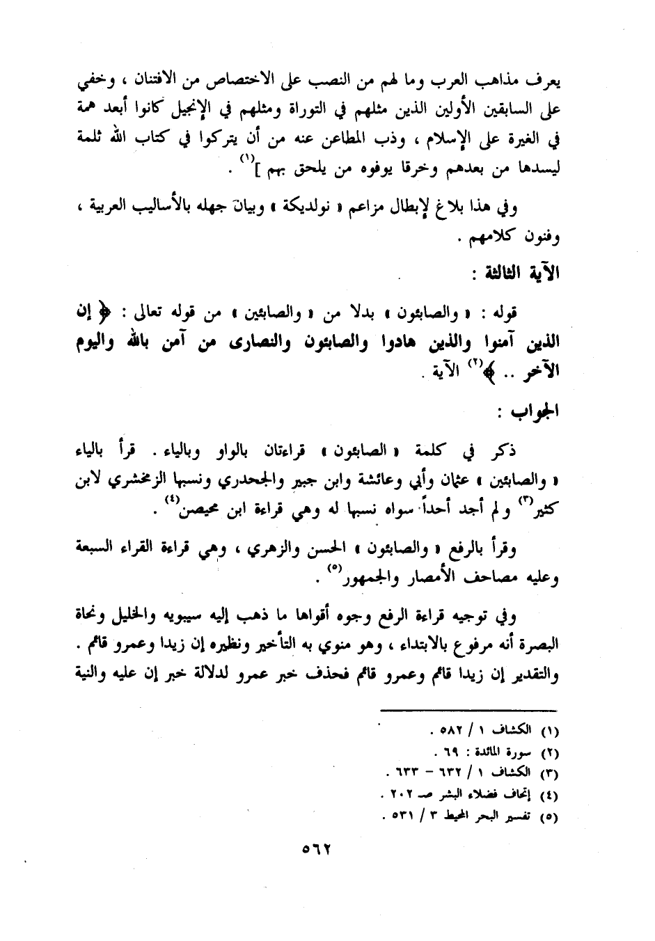 وقرأ بالرفع «والصابئون» الحسن والزهري، وهي قراءة القراء السبعة وعليه مصاحف الأمصار والجمهور «5».