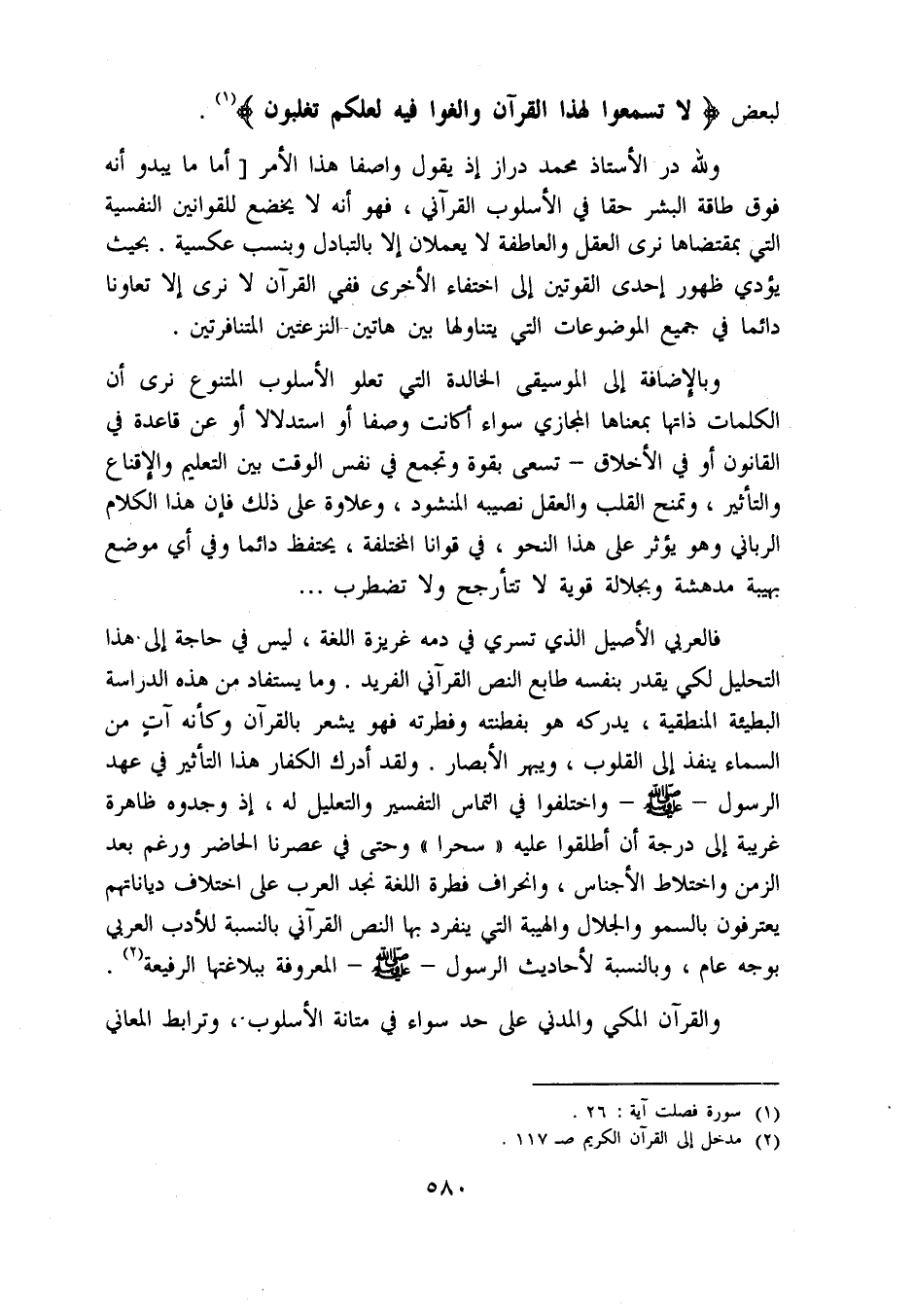 فالعربي الأصيل الذي تسري في دمه غريزة اللغة، ليس في حاجة إلى هذا التحليل لكي يقدر بنفسه طابع النص القرآني الفريد. وما يستفاد من هذه الدراسة البطيئة المنطقية، يدركه هو بفطنته وفطرته فهو يشعر بالقرآن وكأنه آت من السماء ينفذ إلى القلوب، ويبهر الأبصار. ولقد أدرك الكفار هذا التأثير في عهد الرسول - صلّى اللّه عليه وسلم - واختلفوا في التماس التفسير والتعليل له، إذ وجدوه ظاهرة غريبة إلى درجة أن أطلقوا عليه «سحرا» وحتى في عصرنا الحاضر ورغم بعد الزمن واختلاط الأجناس، وانحراف فطرة اللغة نجد العرب على اختلاف دياناتهم يعترفون بالسمو والجلال والهيبة التي ينفرد بها النص القرآني بالنسبة للأدب العربي بوجه عام، وبالنسبة لأحاديث الرسول - صلّى اللّه عليه وسلم - المعروفة ببلاغتها الرفيعة «2».